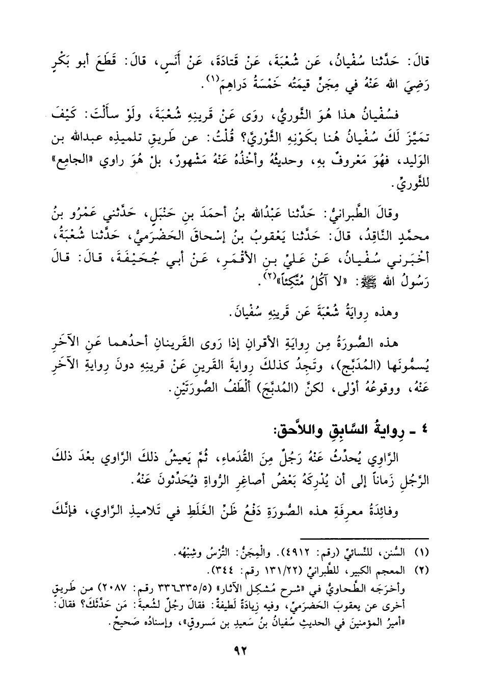 فسفيان هذا هو الثوري، روى عن قرينه شعبة، ولو سألت: كيف تميز لك سفيان هنا بكونه الثوري؟ قلت: عن طريق تلميذه عبد الله بن الوليد، فهو معروف به، وحديثه , وأخذه عنه مشهور، بل هو راوي " الجامع " للثوري.