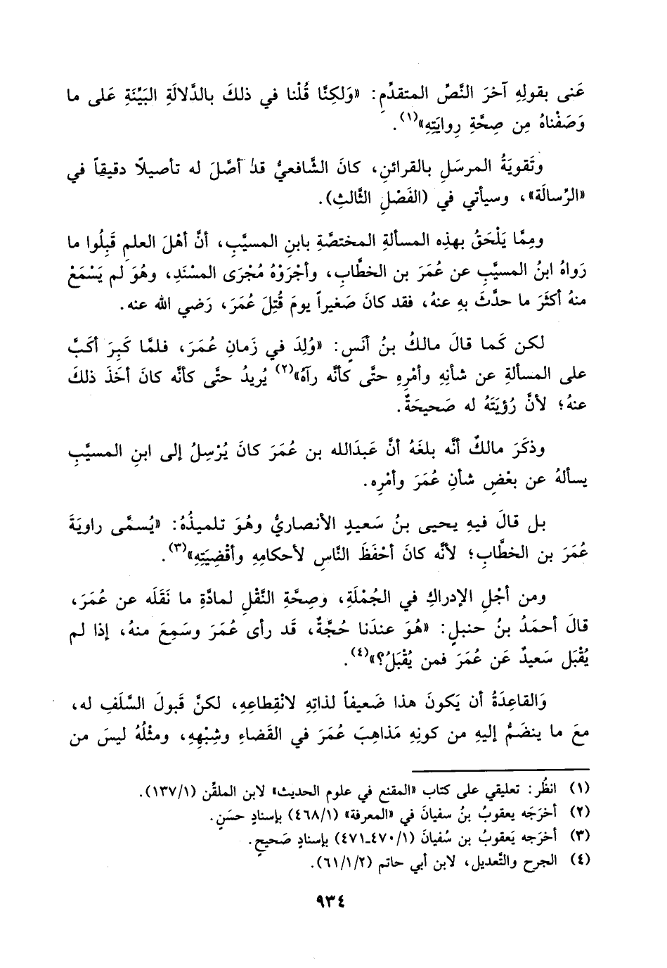 ومما يلحق بهذه المسألة المختصة بأن المسيب، أن أهل العلم قبلوا ما رواه ابن المسيب عن عمر بن الخطاب، وأجروه مجرى المسند، وهو لم يسمع منه أكثر ما حدث به عنه، فقد كان صغيراً يوم قتل عمر، رضي الله عنه.