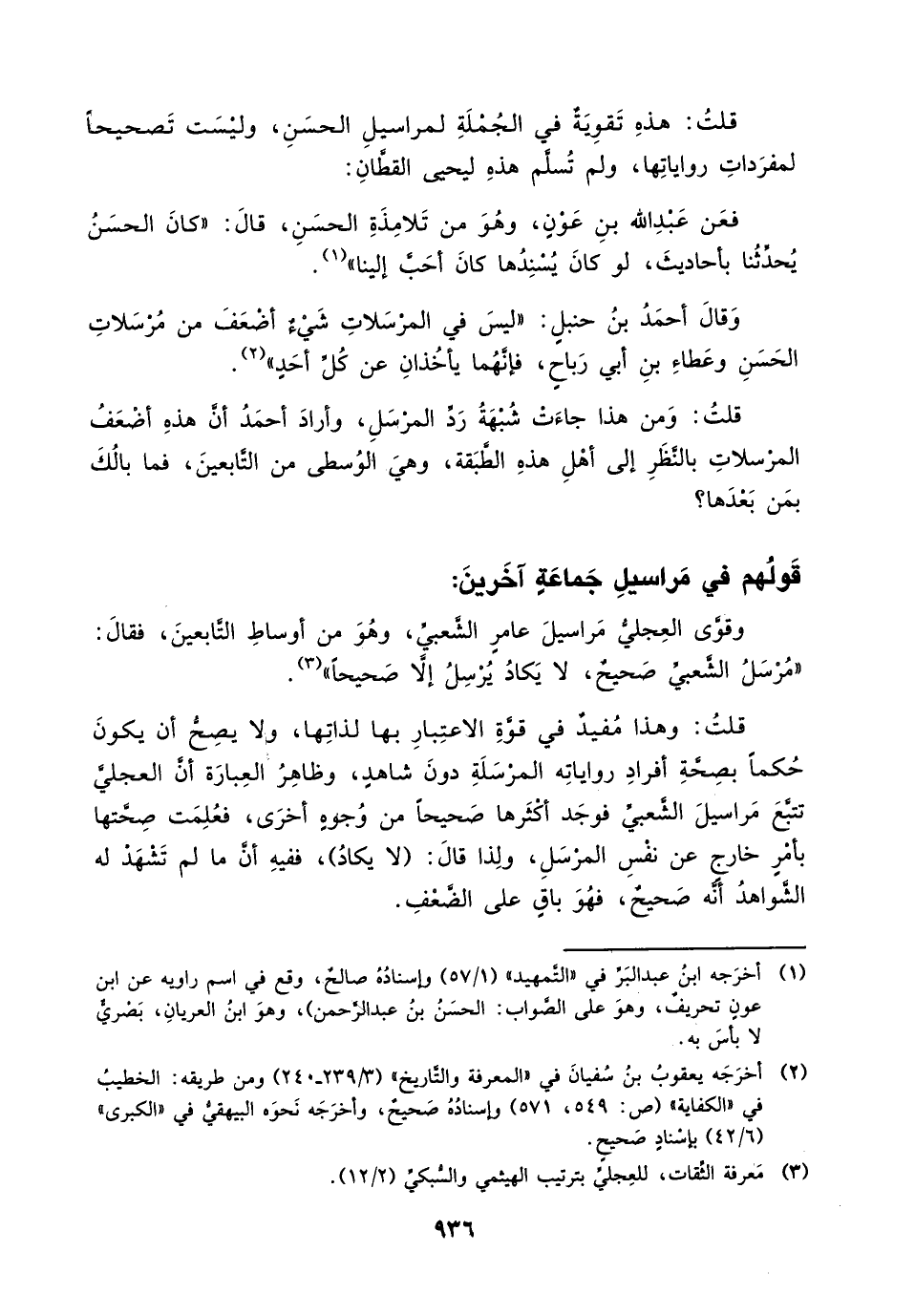 قلت: وهذا مفيد في قوة الاعتبار بها لذاتها، ولا يصح أن يكون حكماً بصحة أفراد رواياته المرسلة دون شاهد، وظاهر العبارة أن العجلي تتبع مراسيل الشعبي فوجد أكثرها صحيحاً من وجوه أخرى، فعُلمت صحتها بأمر خارج عن نفس المرسل، ولذا قال: (لا يكاد)، ففيه أن ما لم تشهد له الشواهد أنه صحيح، فهو باق على الضعف.