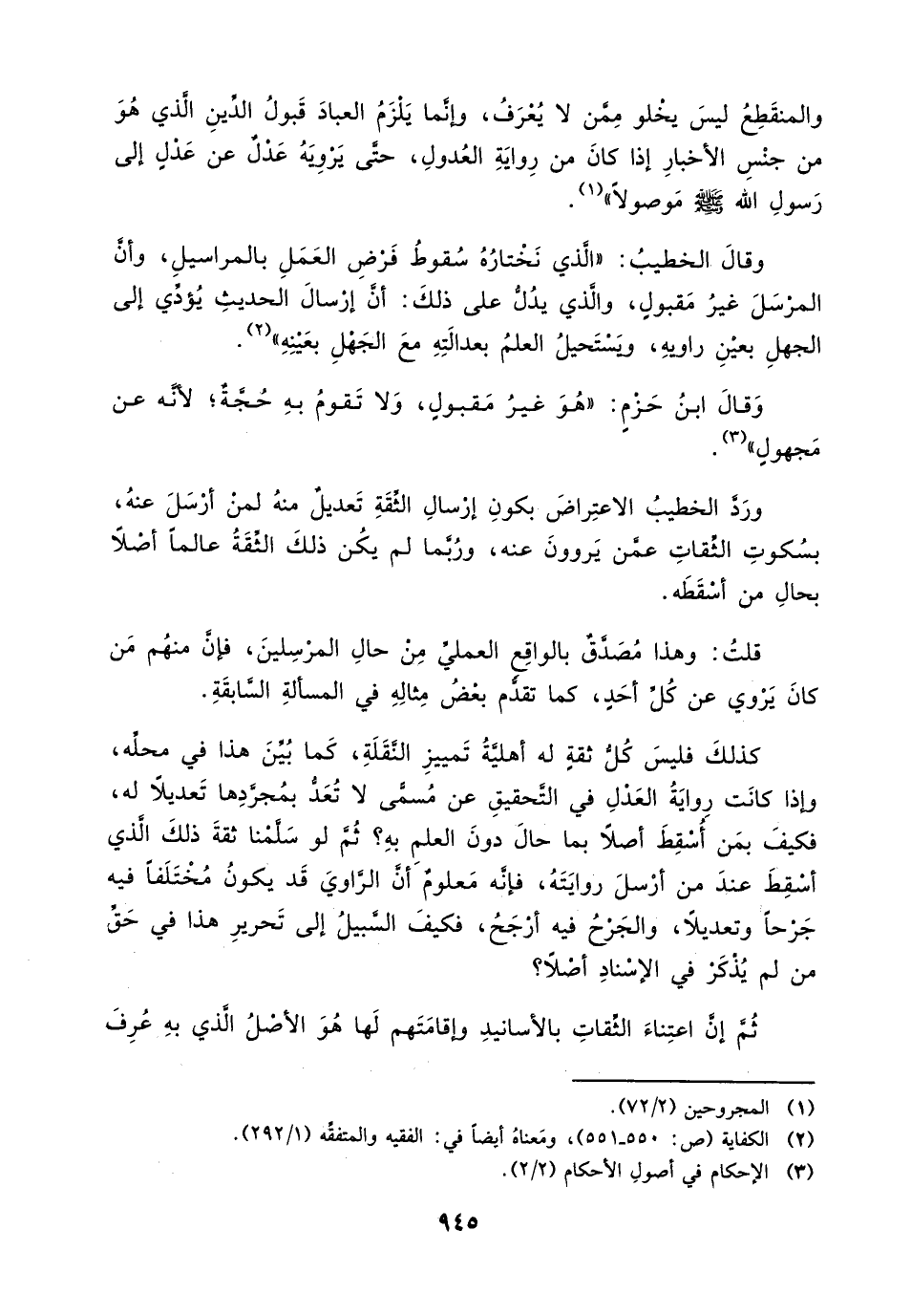 وقال الخطيب: " الذي نختاره سقوط فرض العمل بالمراسيل، وأن المرسل غير مقبول، والذي يدل على ذلك: أن إرسال الحديث يؤدي إلى الجهل بعين راويه، ويستحيل العلم بعدالته مع الجهل بعينه " (¬2).