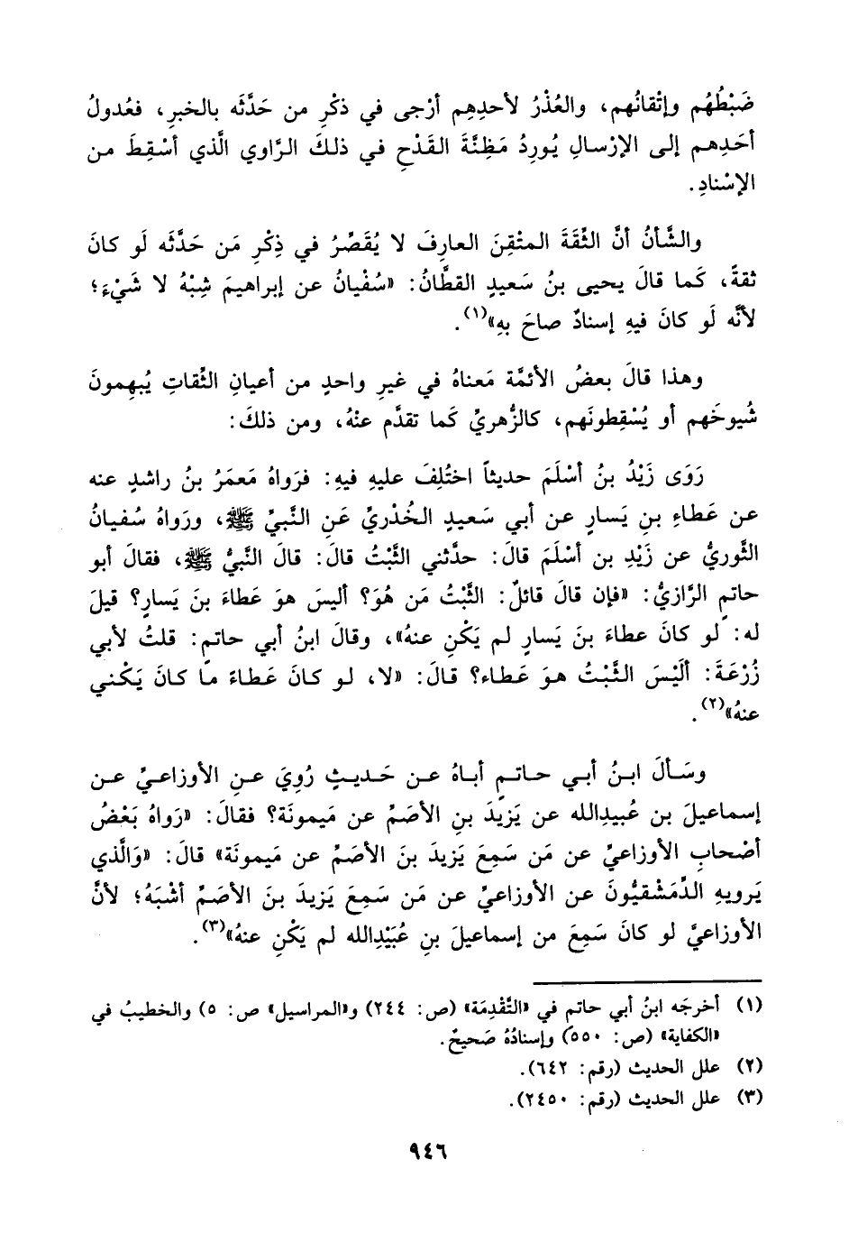 روى زيد بن أسلم حديثاً اختلف عليه فيه: فرواه معمر بن راشد عنه عن عطاء بن يسار عن أبي سعيد الخدري عن النبي صلى الله عليه وسلم، ورواه سفيان الثوري عن زيد بن أسلم قال: حدثني الثبت قال: قال النبي صلى الله عليه وسلم، فقال أبو حاتم الرازي: " فإن قال قائل: الثبت من هو؟ أليس هو عطاء بن يسار؟ قيل له: لو كان عطاء بن يسار لم يكن عنه "، وقال ابن أبي حاتم: قلت لأبي زرعة: أليس الثبت هو عطاء؟ قال: " لا، لو كان عطاء ما كان يكني عنه " (¬2).