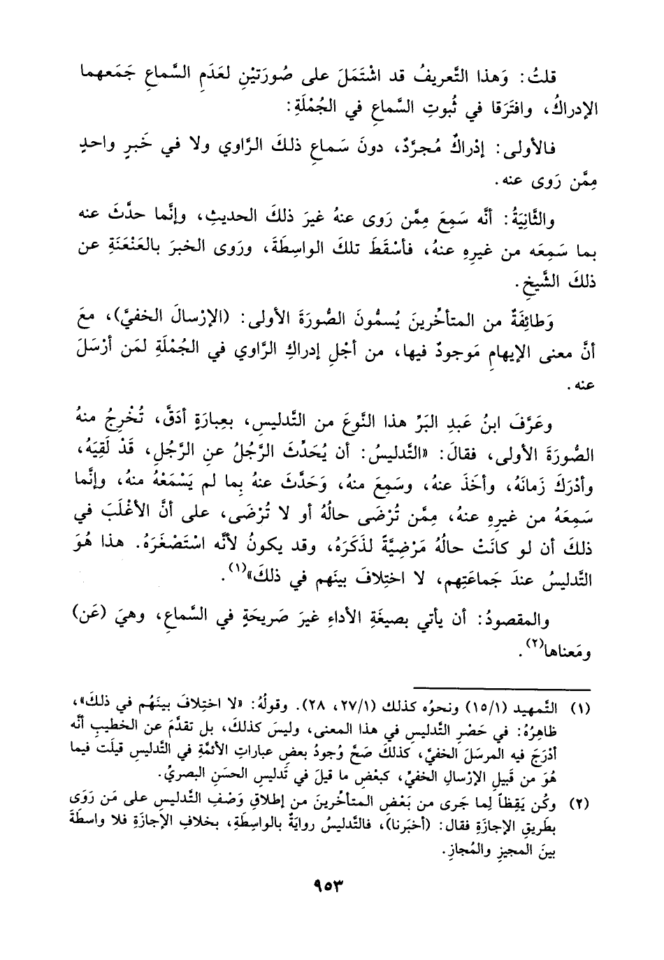 (¬1) التمهيد (1/ 15) ونحوه كذلك (1/ 27، 28). وقوله: لا اختلاف بينهم في ذلك "، ظاهره: في حصْر التدليس في هذا المعنى، وليس كذلك، بل تقدم عن الخطيب أنه أدْرج فيه المرسل الخفي، كذلك صح وُجود بعض عبارات الأئمة في التدليس قيلت فيما هو من قبيل الإرسال الخفي، كبعض ما قيل في تدليس الحسن البصري.