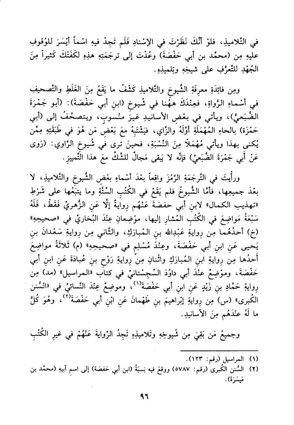 في التلاميذ، فلو أنك نظرت في الإسناد فلم تجد فيه اسماً أيسر للوقوف عليه من (محمد بن أبي حفصة) وعدت إلى ترجمته هذه لكفتك كثيراً من الجهد للتعرف على شيخه وتلميذه.