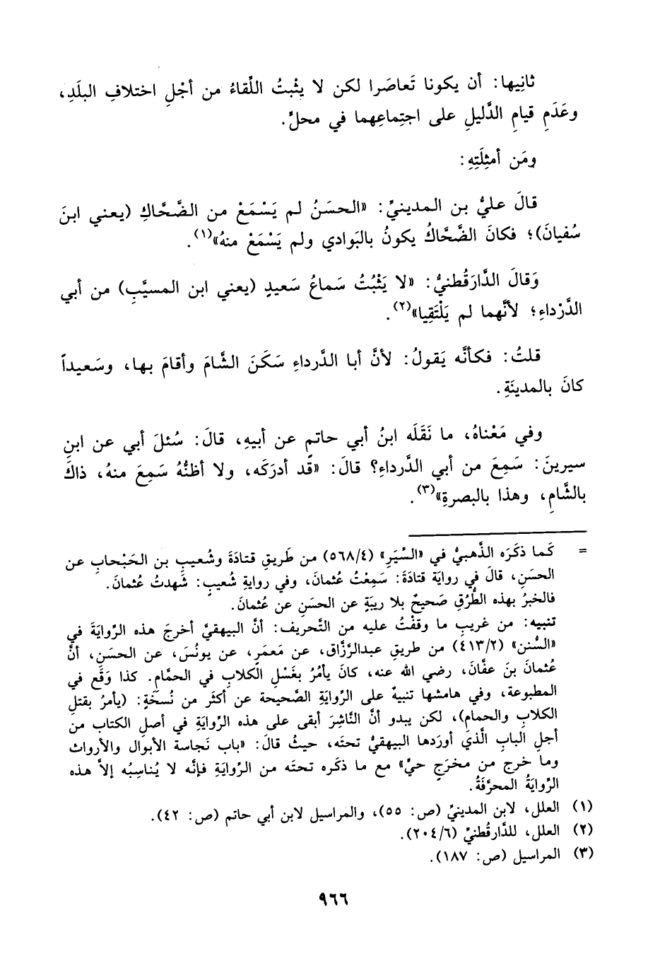 وفي معناه، ما نقله ابن أبي حاتم عن أبيه، قال: سئل أبي عن ابن سيرين: سمع من أبي الدرداء؟ قال: " قد أدركه، ولا أظنه سمع منه، ذاك بالشام، وهذا بالبصرة " (¬3).