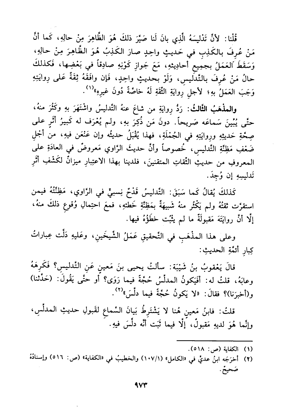 والمذهب الثالث: رد رواية من شاع عنه التدليس واشتهر به وكثر منه، حتى يبين سماعه صريحاً. دون من ذكر به، ولم يعرف له كبير أثر على صحة حديثه وروايته في الجملة، فهذا يقبل حديثه وإن عنعن فيه، من أجل ضعف مظنة التدليس، خصوصاً وأن حديث الراوي معروض في العادة على المعروف من حديث الثقات المتقنين، فلدينا بهذا الاعتبار ميزان لكشف أثر تدليسه إن وجد.