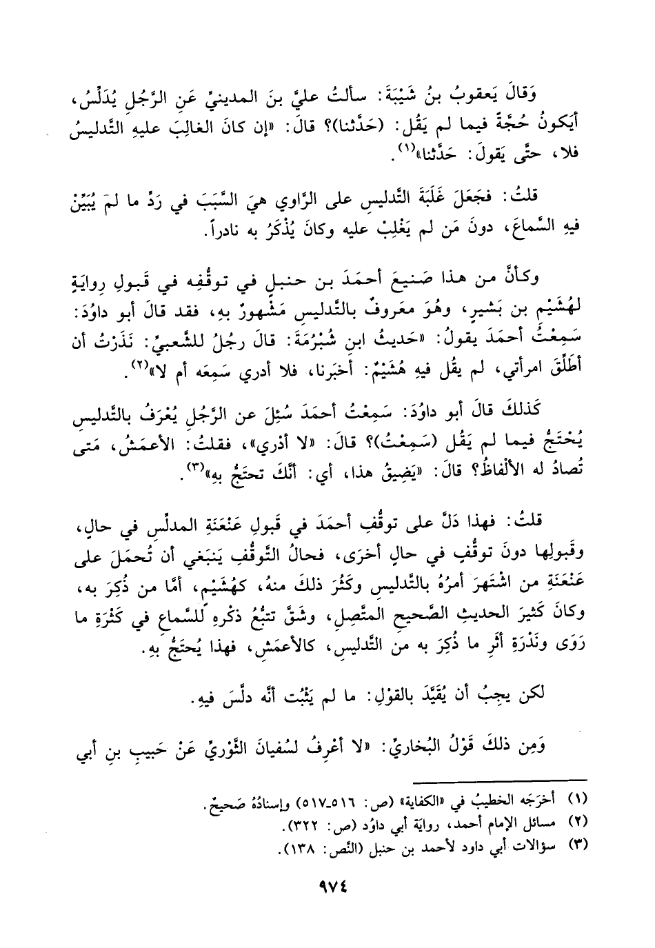 قلت: فهذا د ل على توقف أحمد في قبول عنعنة المدلس في حال، وقبولها دون توقف في حال أخرى، فحال التوقف ينبغي أن تحمل على عنعنة من اشتهر أمره بالتدليس وكثر ذلك منه كهشيم، أما من ذكر به وكان كثير الحديث الصحيح المتصل، وشق تتبع ذكره للسماع في كثرة ما روى وندرة أثر ما ذكر به من التدليس، كالأعمش، فهذا يحتج به.