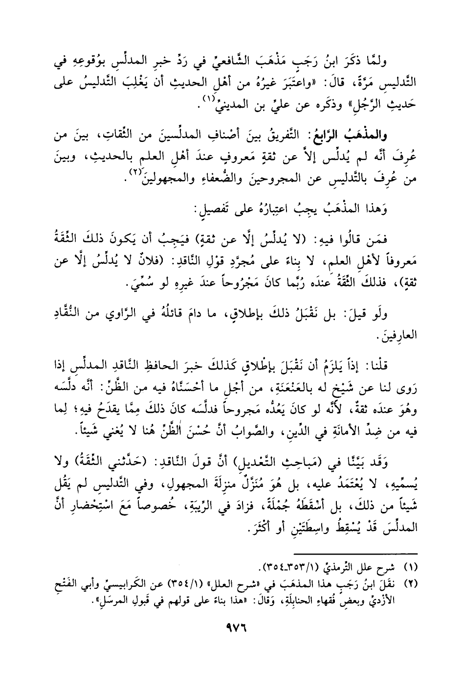 والمذهب الرابع: التفريق بين أصناف المدلسين من الثقات، بين من عرف أنه لم يدلس إلا عن ثقة معروف عند أهل العلم بالحديث، وبين من عرف بالتدليس عن المجروحين والضعفاء والمجهولين (¬2).
