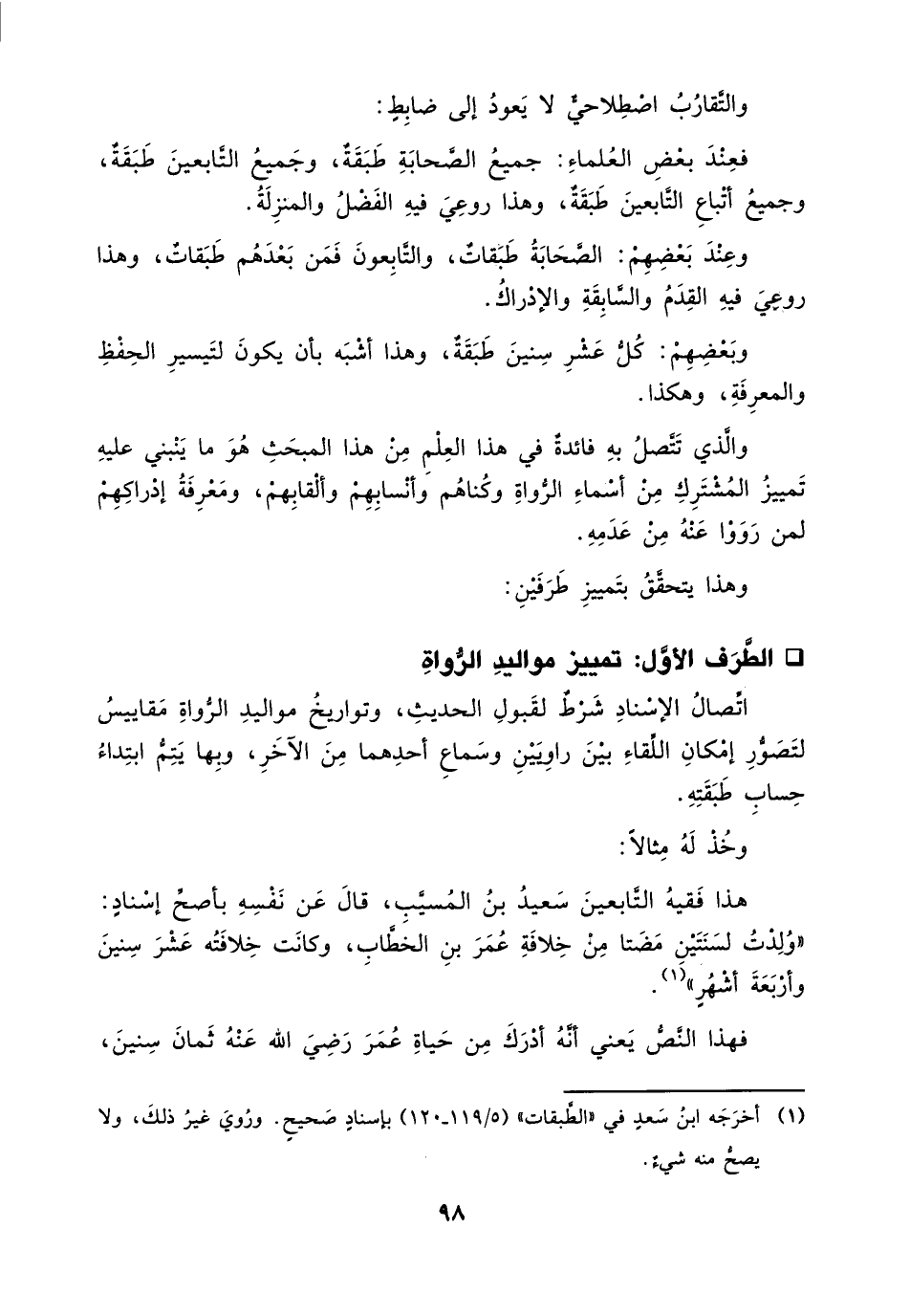 وعند بعضهم: الصحابة طبقات، والتابعون فمن بعدهم طبقات، وهذا روعي فيه القدم والسابقة والإدراك.