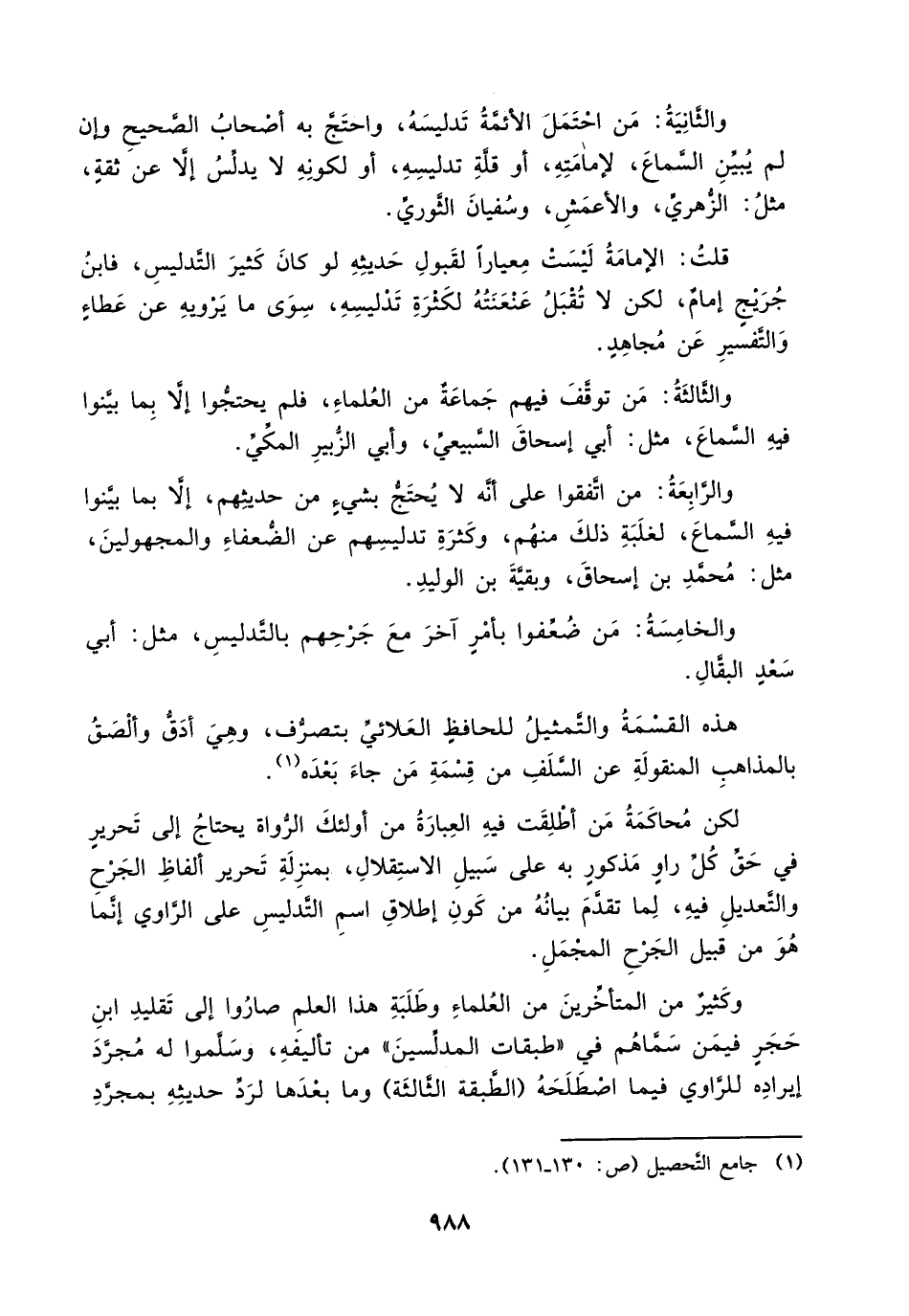 هذه القسمة والتمثيل للحفاظ العلائي بتصرف، وهي أدق وألصق بالمذاهب المنقولة عن السلف من قسمة من جاء بعده (¬1).