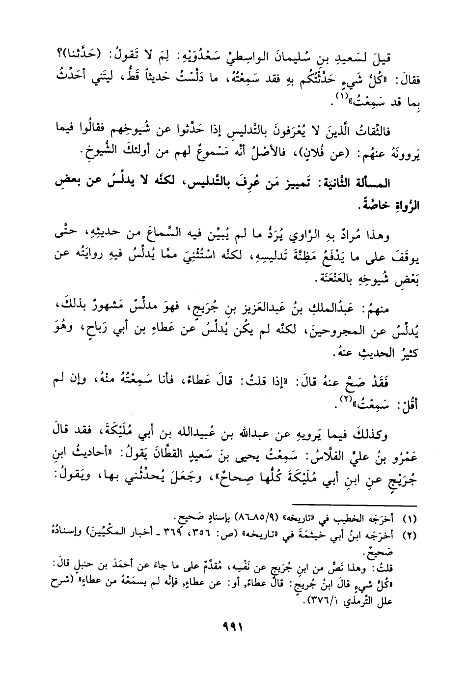 قلت: وهذا نصٌّ من ابن جريج عن نفسه، مُقدم على ماجاء عن أحمد بن حنبل قال: " كلُّ شيء قال ابن جريج: قال عطاء، أو عن عطاء فإنه لم يسمعه من عطاء " (شرح علل الترمذي 1/ 376).