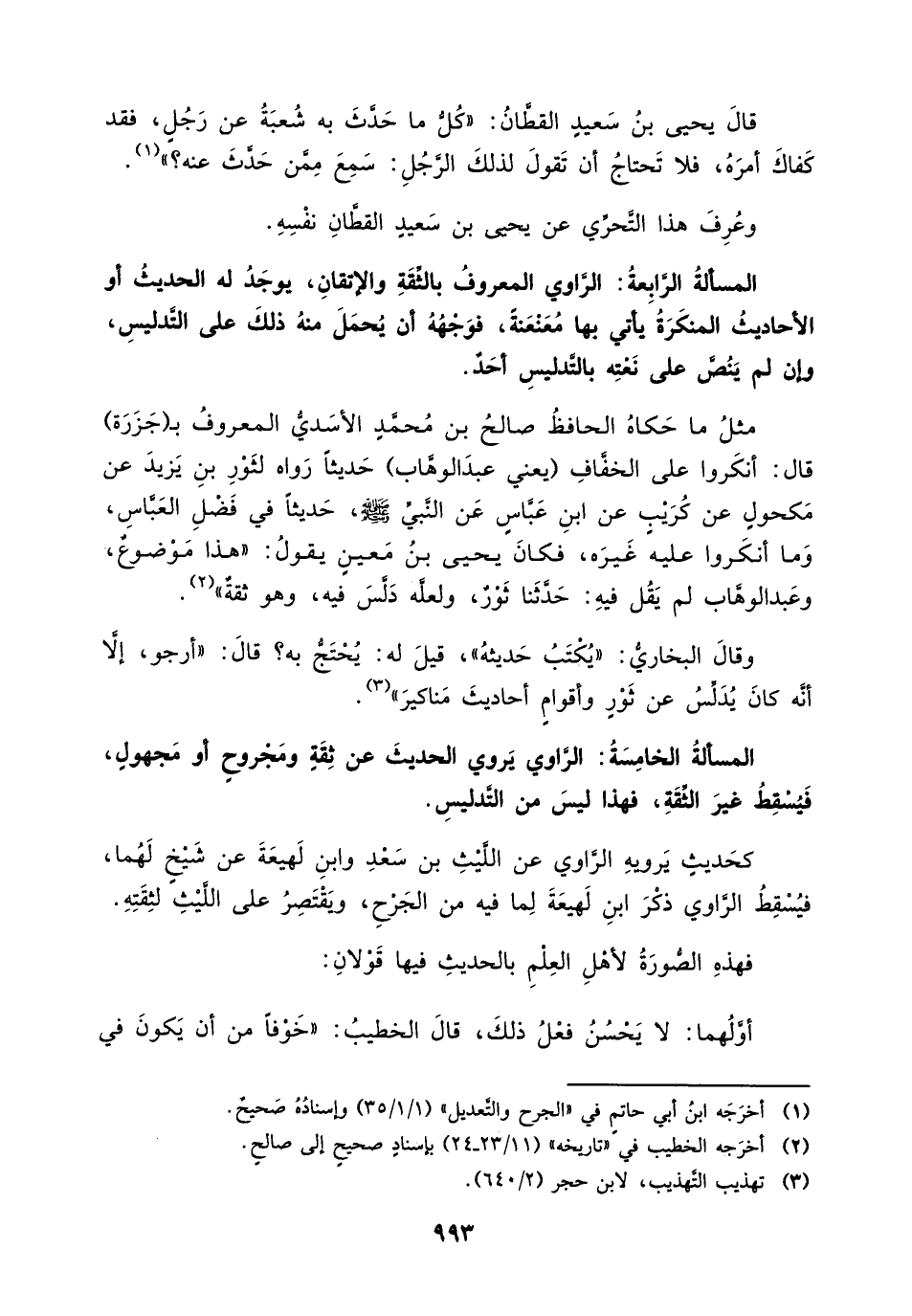 المسألة الرابعة: الراوي المعروف بالثقة والإتقان، يوجد له الحديث أو الأحاديث المنكرة يأتي بها معنعنة، فوجهه أن يحمل منه ذلك على التدليس، وإن لم ينص على نعته بالتدليس أحد.