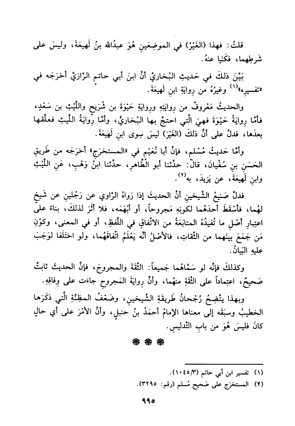 قلت: فهذا (الغير) في الموضعين هو عبد الله بن لهيعة، وليس على شرطهما، فكنيا عنه.