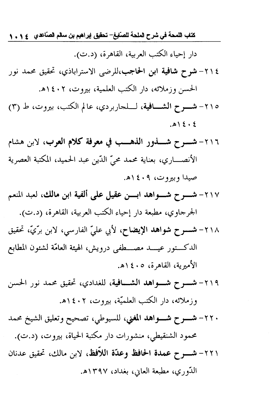 219- شرح شواهد الشافية، للغدادي، تحقيق محمد نور الحسن وزملائه، دار الكتب العلميّة، بيروت، 1402هـ.