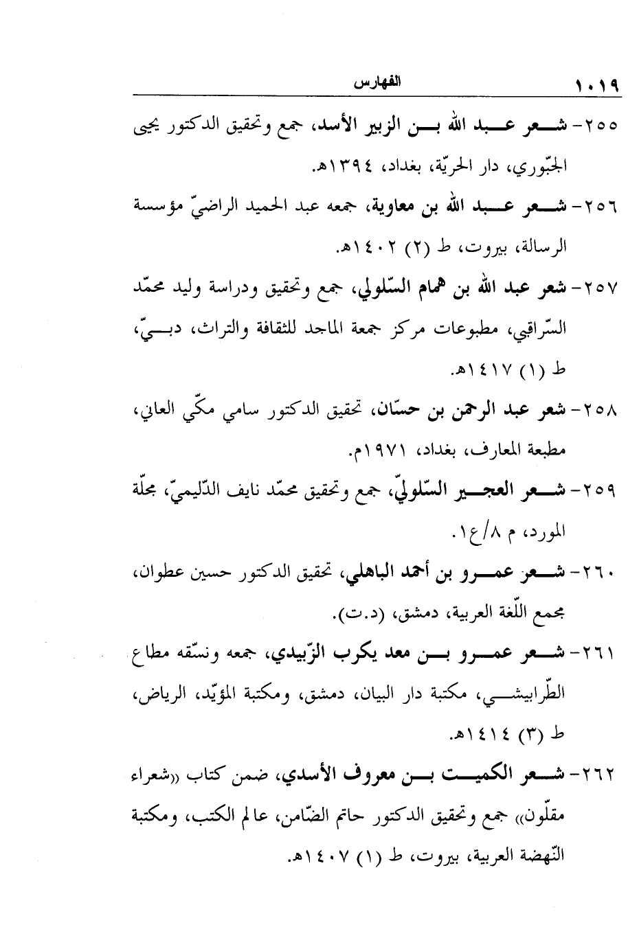 255- شعر عبد الله بن الزبير الأسد، جمع وتحقيق الدكتور يحيى الجبّوري، دار الحريّة، بغداد، 1394هـ.