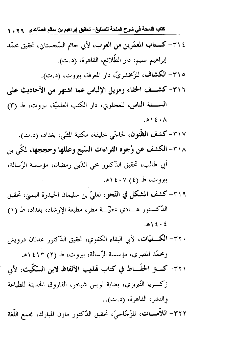 320- الكليّات، لأبي البقاء الكفوي، تحقيق الدّكتور عدنان درويش ومحمّد المصري، مؤسسة الرّسالة، بيروت، ط (2) 1413هـ.