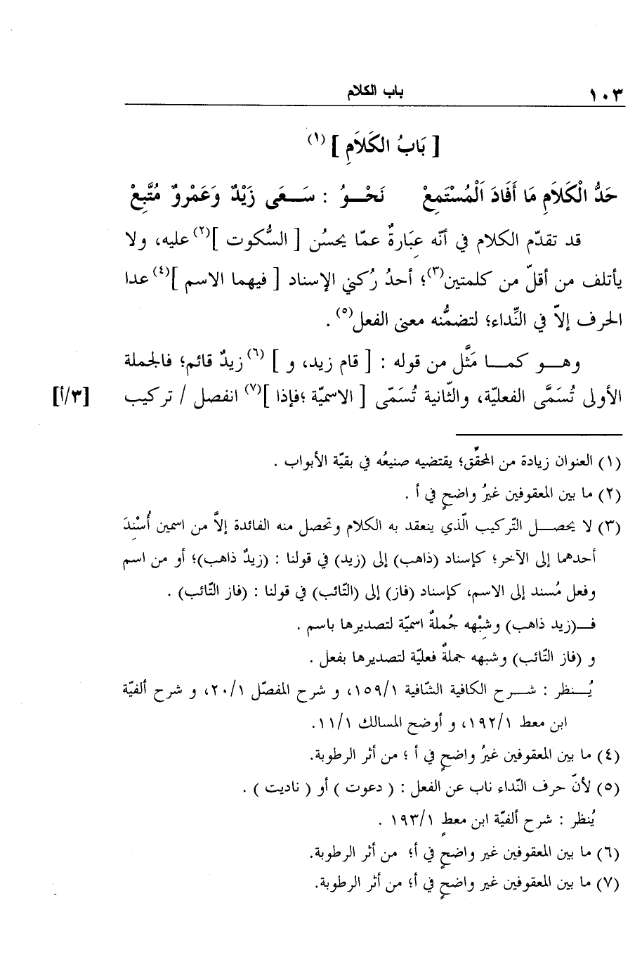 3 لا يحصل التّركيب الّذي ينعقد به الكلام وتحصل منه الفائدة إلاَّ من اسمين أُسْنِدَ أحدهما إلى الآخر؛ كإسناد (ذاهب) إلى (زيد) في قولنا: (زيدٌ ذاهب) ؛ أو من اسم وفعل مُسند إلى الاسم، كإسناد (فاز) إلى (التّائب) في قولنا: (فاز التّائب) .