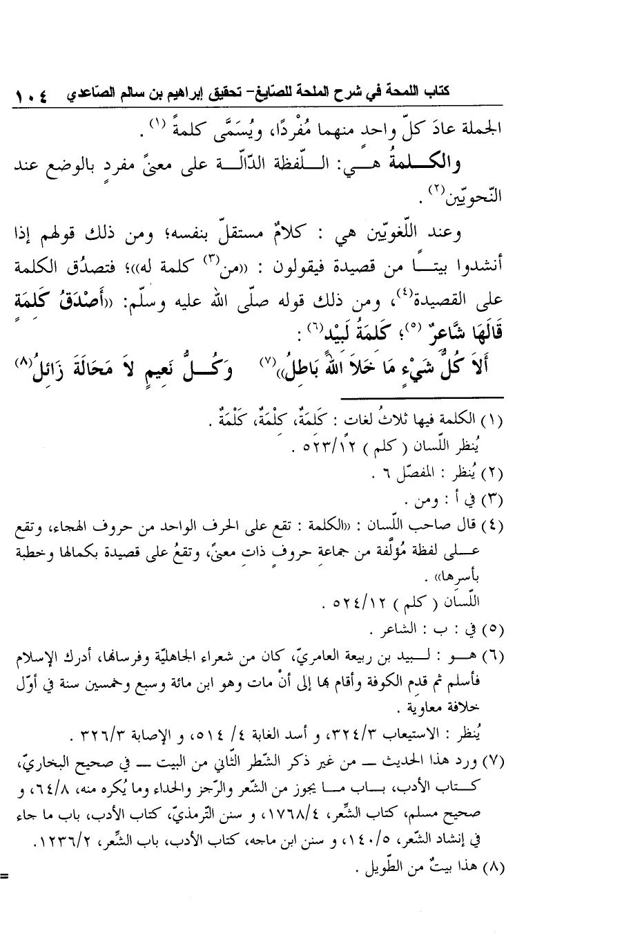 والكلمةُ هي: اللّفظة الدّالّة على معنىً مفردٍ بالوضع عند النّحويّين2. وعند اللّغويّين هي: كلامٌ مستقلّ بنفسه؛ ومن ذلك قولهم إذا أنشدوا بيتًا من قصيدة فيقولون: "من3كلمة له"؛فتصدُق الكلمة على القصيدة4، ومن ذلك قوله صلّى الله عليه وسلّم: " أَصْدَقُ كَلِمَةٍ قَالَهَا شَّاعِرٌ5؛ كَلِمَةُ لَبِيْدٍ6: