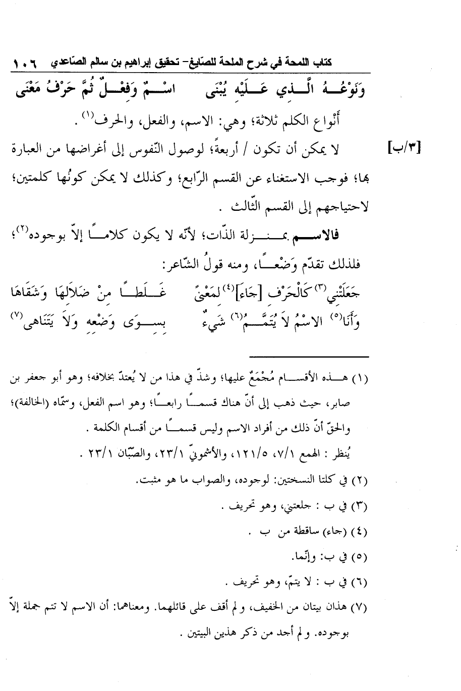 1 هذه الأقسام مُجْمَعٌ عليها؛ وشذّ في هذا من لا يُعتدّ بخلافه؛ وهو أبو جعفر بن صابر، حيث ذهب إلى أنّ هناك قسمًا رابعًا؛ وهو اسم الفعل، وسمّاه (الخالفة) ؛ والحقّ أنّ ذلك من أفراد الاسم وليس قسمًا من أقسام الكلمة.