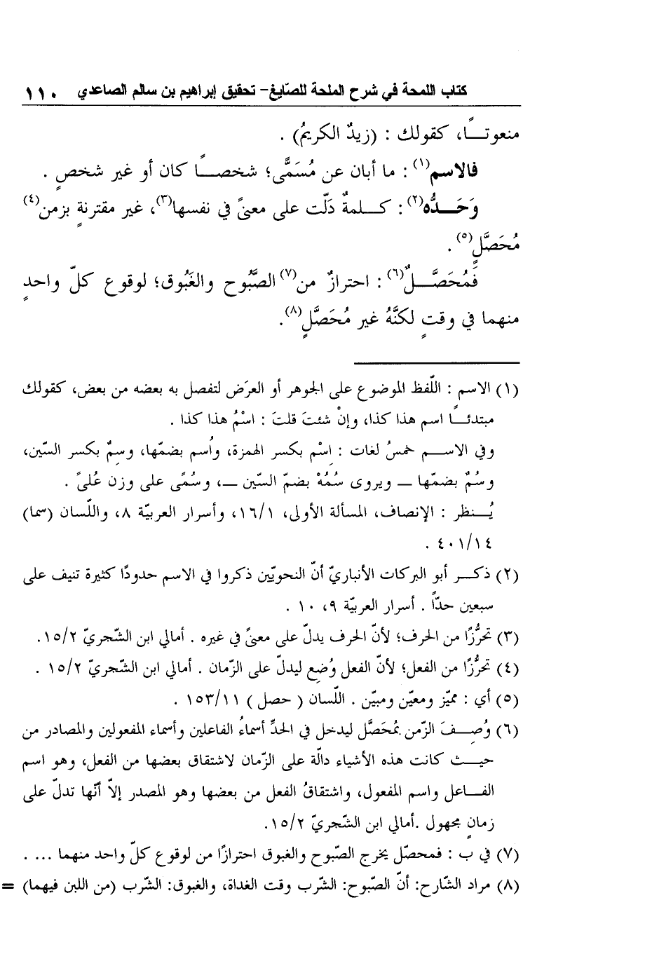 6 وُصِفَ الزّمن بمُحَصَّل ليدخل في الحدِّ أسماءُ الفاعلين وأسماء المفعولين والمصادر من حيث كانت هذه الأشياء دالّة على الزّمان لاشتقاق بعضها من الفعل، وهو اسم الفاعل واسم المفعول، واشتقاقُ الفعل من بعضها وهو المصدر إلاّ أنّها تدلّ على زمانٍ مجهول. أمالي ابن الشّجريّ 2/15.