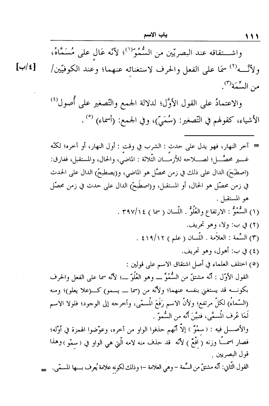واشتقاقه عند البصريّين من السُّمُوّ1؛ لأنّه عَالٍ على مُسَمَّاهُ، ولأنَّه2 سمَا على الفعل والحرف لاستغنائِه عنهما؛ وعند الكوفيّين [4/ب] من السِّمَة3.