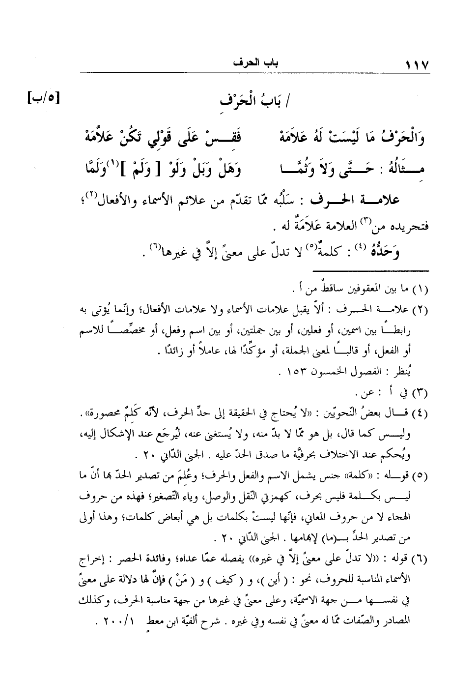 4 قال بعضُ النّحويّين: "لا يُحتاج في الحقيقة إلى حدِّ الحرف، لأنّه كَلِمٌ محصورة" وليس كما قال، بل هو ممّا لا بدّ منه، ولا يُستغنى عنه، ليُرجَع عند الإشكال إليه، ويُحكم عند الاختلاف بحرفيَّة ما صدق الحدّ عليه. الجنى الدّاني 20.
