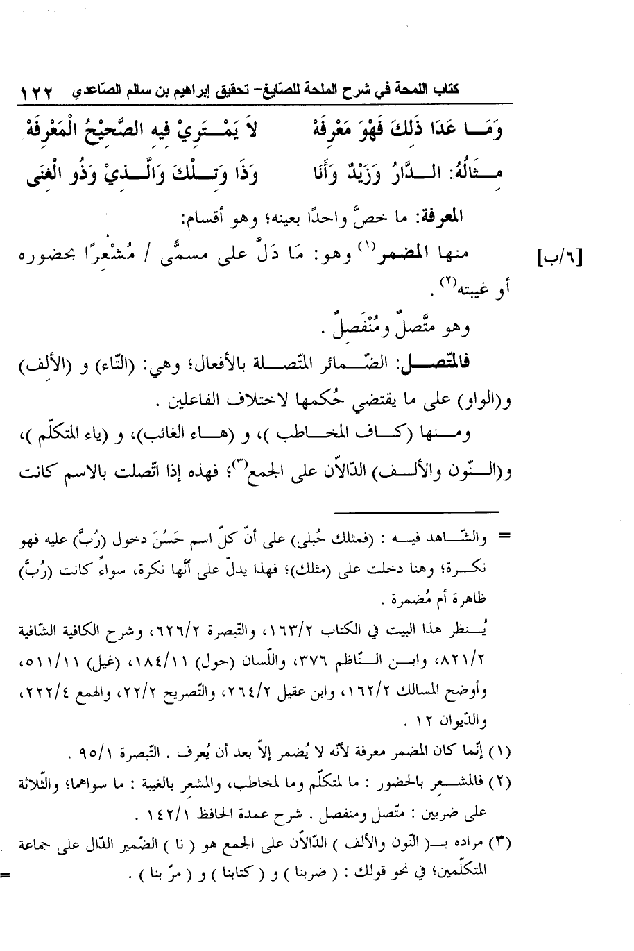 2 فالمشعِر بالحضور: ما لمتكلّم وما لمخاطب، والمشعِر بالغيبة: ما سواهما؛ والثّلاثة على ضربين: متّصل ومنفصل. شرح عمدة الحافظ 1/142.