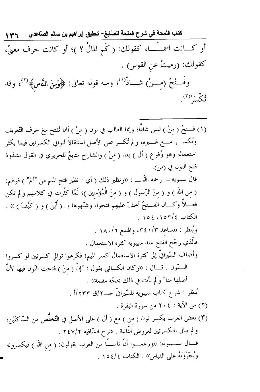 1 فتحُ (مِنْ) ليس شاذًّا؛ وإنما الغالب في نون (مِنْ) أنها تُفتح مع حرف التّعريف وتُكسر مع غيره، ولم تُكسر على الأصل استثقالاً لتوالي الكسرتين فيما يكثر استعماله وهو وُقوع (أل) بعد (مِنْ) والشارح متابعٌ للحريري في القول بشذوذ فتح النون في (من) .