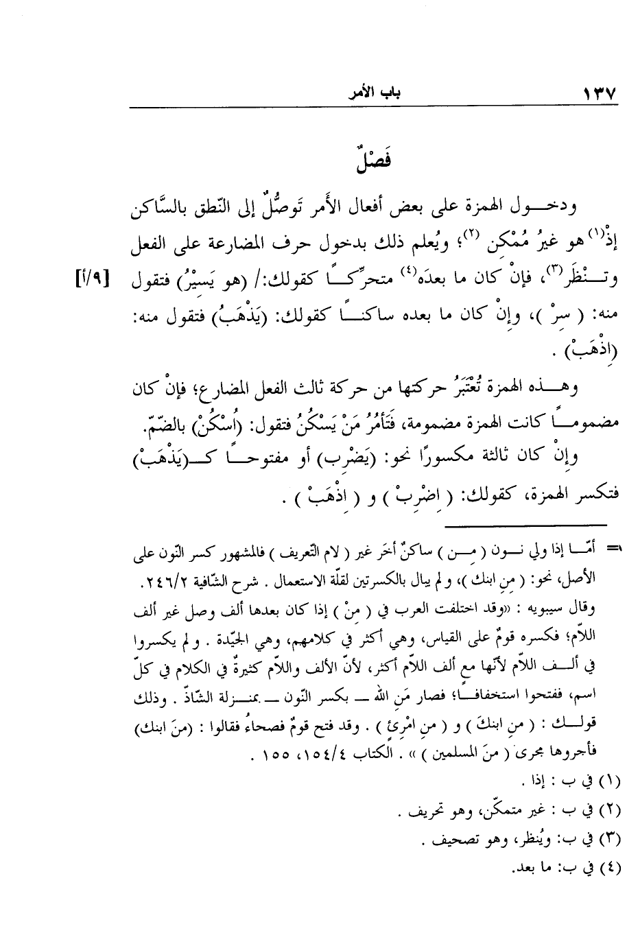 ودخول الهمزة على بعض أفعال الأَمر تَوصُّلٌ إلى النّطق بالسَّاكن إذْ1 هو غيرُ مُمْكِن 2؛ ويُعلم ذلك بدخول حرف المضارعة على الفعل وتنْظَر3، فإنْ كان ما بعدَه4 متحرِّكًا كقولك: (هو يَسِيْرُ) فتقول منه: (سِرْ) ، وإِنْ كان ما بعده ساكنًا كقولك: (يَذْهَبُ) فتقول منه: (اِذْهَبْ) .