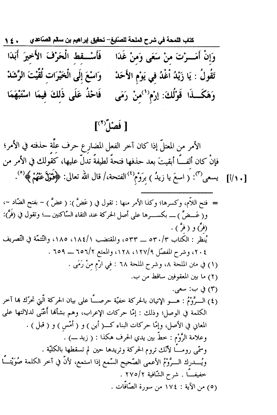 [10/أ] الأمر من المعتلّ إذا كان آخر الفعل المضارِع حرف عِلَّةٍ حذفته في الأمر؛ فإنْ كان ألِفًا أبقيتَ بعد حذفها فتحةً لطيفةً تدلّ عليها، كقولك في الأمر من يسعى3: (اسعَ يا زيدُ) بِرَوْمِ4 الفتحة، قال الله تعالى: {فَتَوَلَّ عَنْهُمْ} 5.
