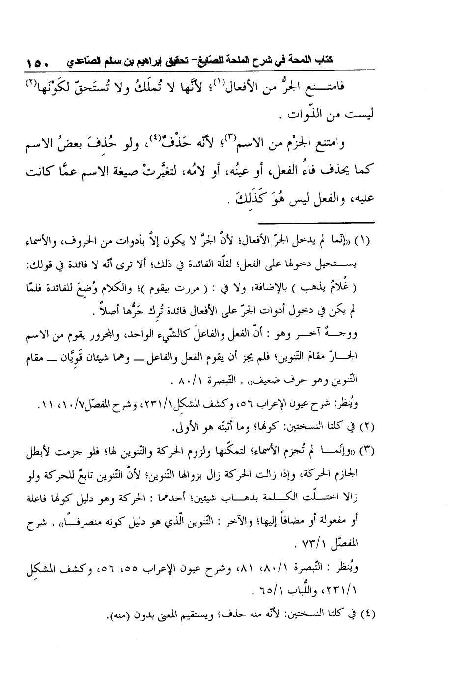 3 "وإنّما لم تُجزم الأسماء؛ لتمكّنها ولزوم الحركة والتّنوين لها؛ فلو جزمت لأبطل الجازم الحركة، وإذا زالت الحركة زال بزوالها التّنوين؛ لأنّ التّنوين تابعٌ للحركة ولو زالا اختلّت الكلمة بذهاب شيئين؛ أحدهما: الحركة وهو دليل كونها فاعلة أو مفعولة أو مضافاً إليها؛ والآخر: التّنوين الّذي هو دليل كونه منصرفًا". شرح المفصّل 1/73.