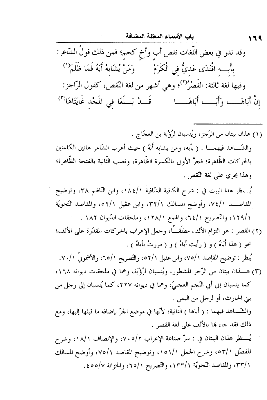 والشّاهد فيهما: (بأبه، ومن يشابِه أَبَهُ) حيث أعرب الشّاعر هاتين الكلمتين بالحركات الظّاهرة؛ فجرَّ الأولى بالكسرة الظّاهرة، ونصب الثّانية بالفتحة الظّاهرة؛ وهذا يجري على لغة النّقص.