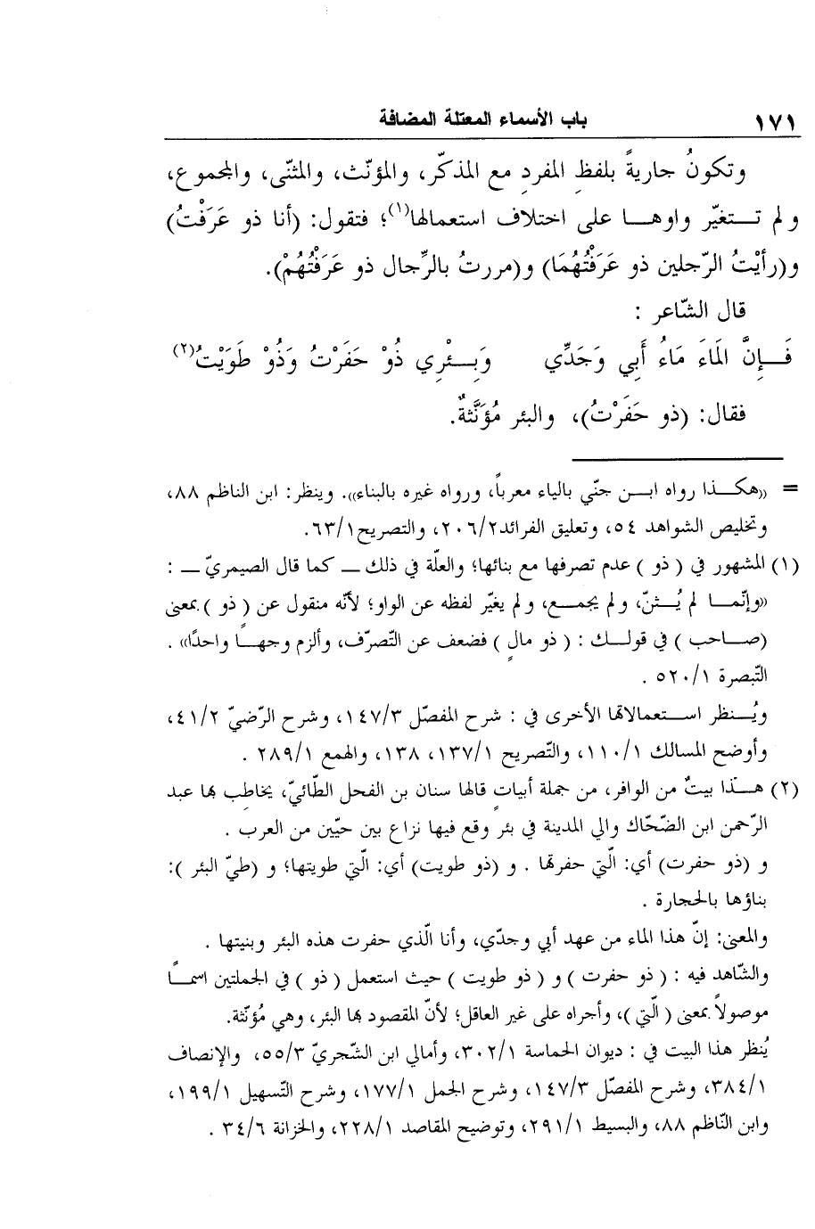 والشّاهد فيه: (ذو حفرت) و (ذو طويت) حيث استعمل (ذو) في الجملتين اسمًا موصولاً بمعنى (الّتي) ، وأجراه على غير العاقل؛ لأنّ المقصود بها البئر، وهي مُؤنّثة.
