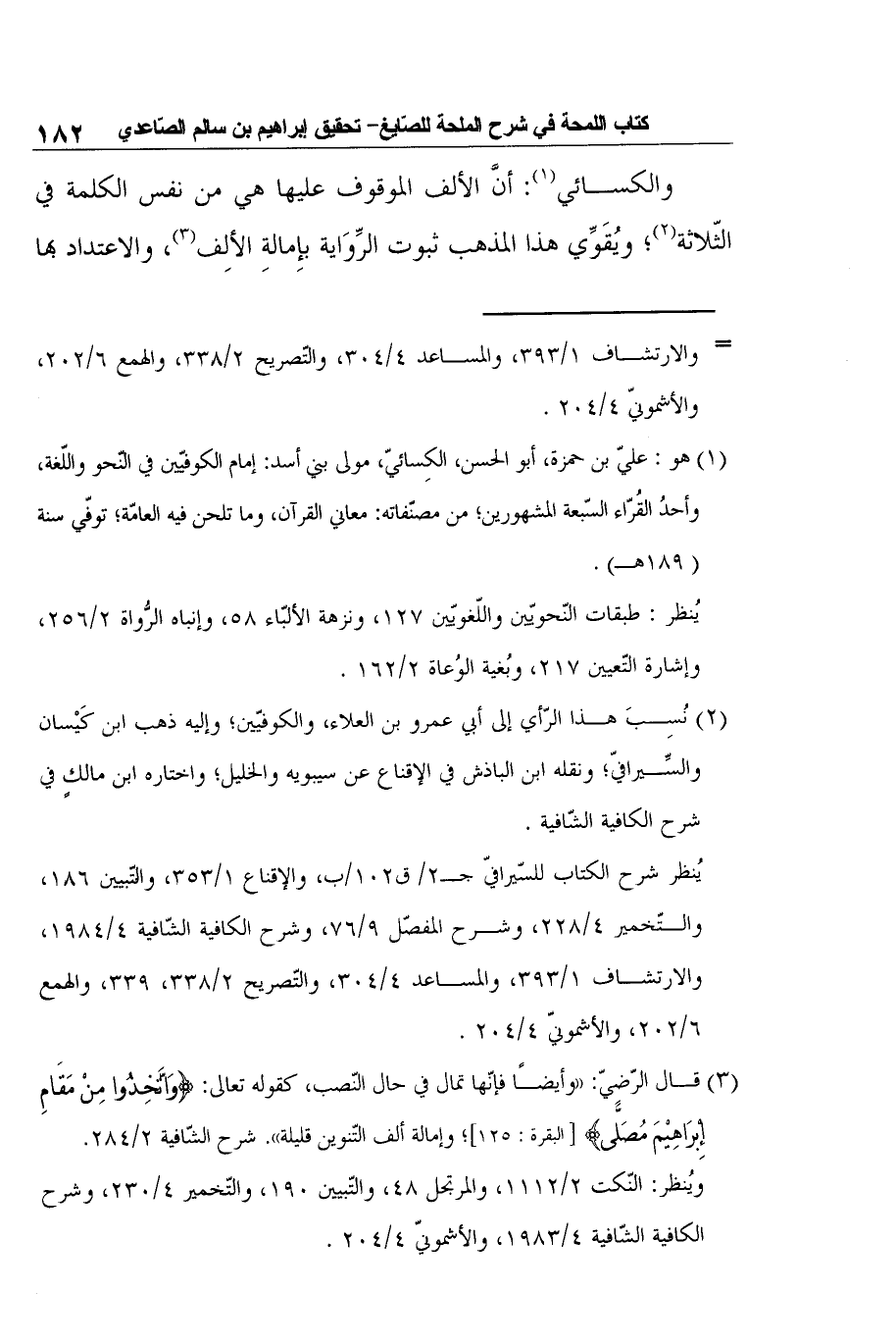 1 هو: عليّ بن حمزة، أبو الحسن، الكِسائيّ، مولى بني أسد: إمام الكوفيّين في النّحو واللّغة، وأحدُ القُرّاء السّبعة المشهورين؛ من مصنّفاته: معاني القرآن، وما تلحن فيه العامّة؛ توفّي سنة (189هـ) .