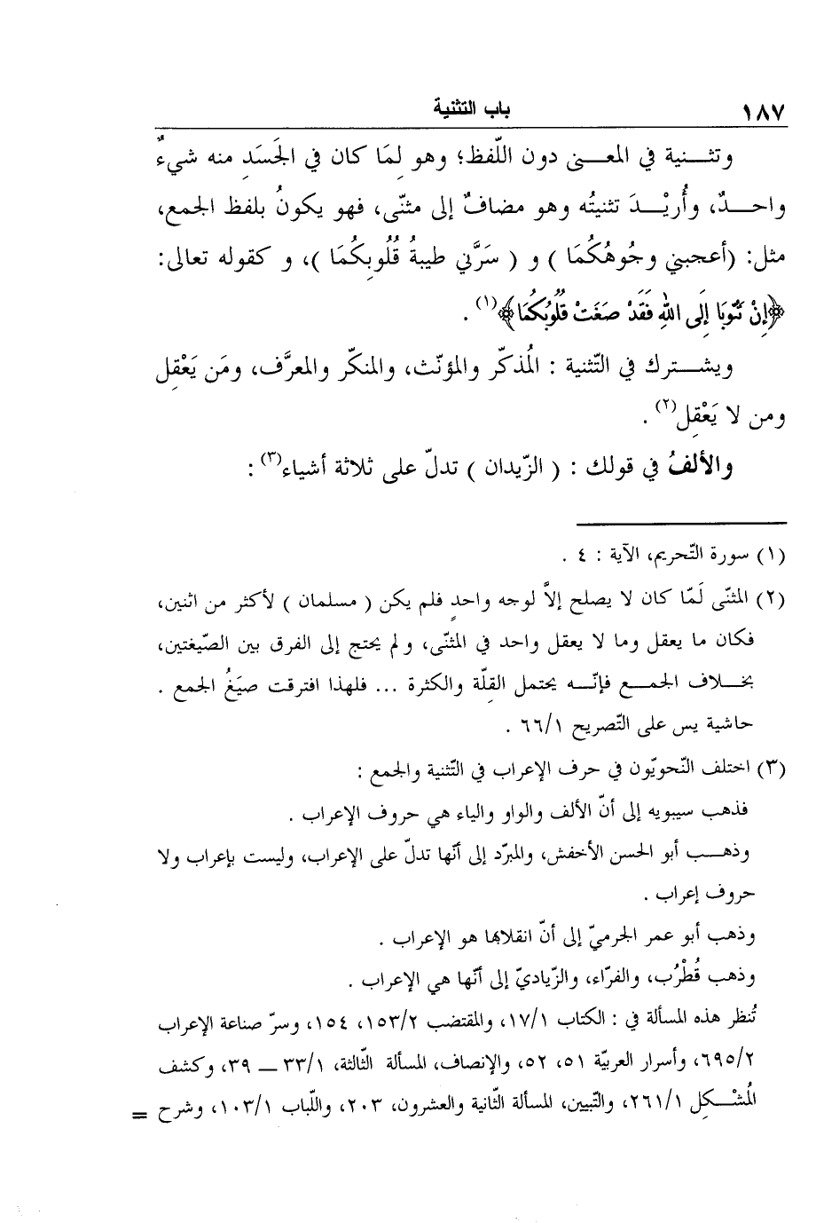2 المثنّى لَمّا كان لا يصلح إلاَّ لوجه واحدٍ فلم يكن (مسلمان) لأكثر من اثنين، فكان ما يعقل وما لا يعقل واحد في المثنّى، ولم يحتج إلى الفرق بين الصّيغتين، بخلاف الجمع فإنّه يحتمل القِلّة والكثرة فلهذا افترقت صيَغُ الجمع حاشية يس على التّصريح 1/66.
