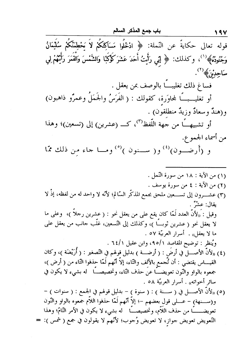 فساغ ذلك تغليبًا بالوصف بمن يعقل. أو تغليبًا لمجاوَرةٍ، كقولك: (الفَرَسُ والجَمَلُ وعمرٌو ذاهبون) و (هندٌ وسعادٌ وزيدٌ منطلِقون) .أو تشبيهًا من جهة اللّفظ3، كـ (عشرين) إلى (تسعين) ؛ وهذا من أسماء الجموع. و (أَرضون) 4 و (سنون) 5 وما جاء مِن ذلك ممّا