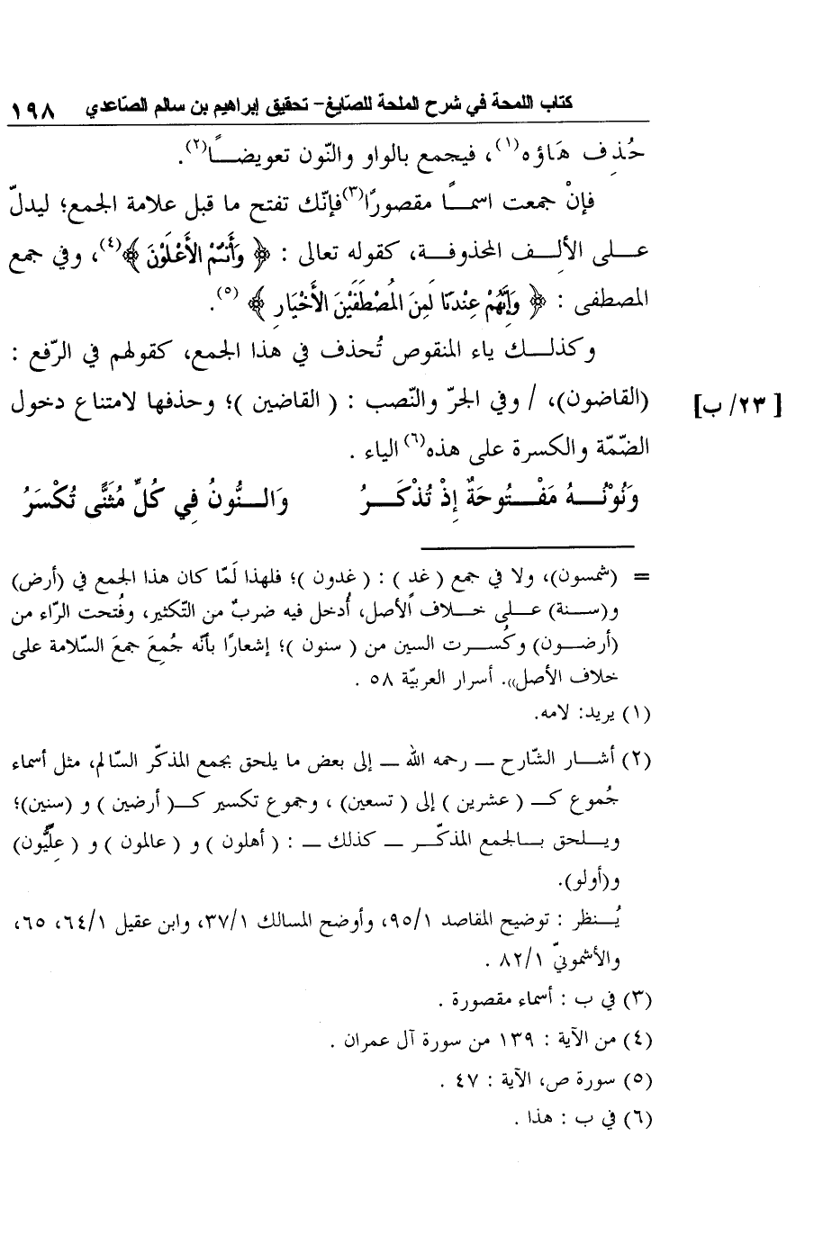 2 أشار الشّارح -رحمه الله - إلى بعض ما يلحق بجمع المذكّر السّالم، مثل أسماء جُموع كـ (عشرين) إلى (تسعين) ، وجموع تكسير كـ (أرضين) و (سنين) ؛ ويلحق بالجمع المذكّر- كذلك -: (أهلون) و (عالمون) و (عِلِّيُّون) و (أولو) .