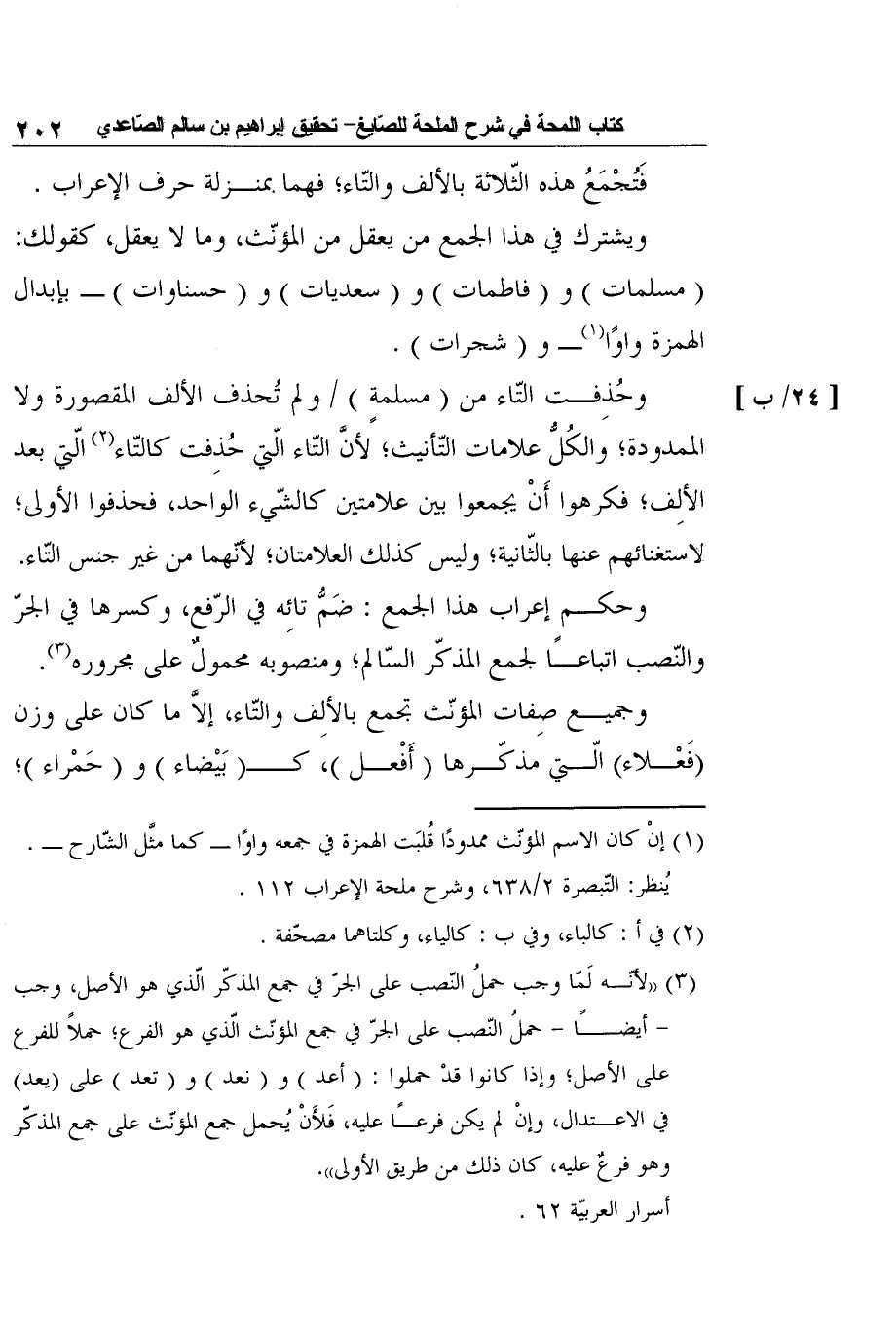 1 إنْ كان الاسم المؤنّث ممدودًا قُلبَت الهمزة في جمعه واوًا - كما مثَّل الشّارح -.