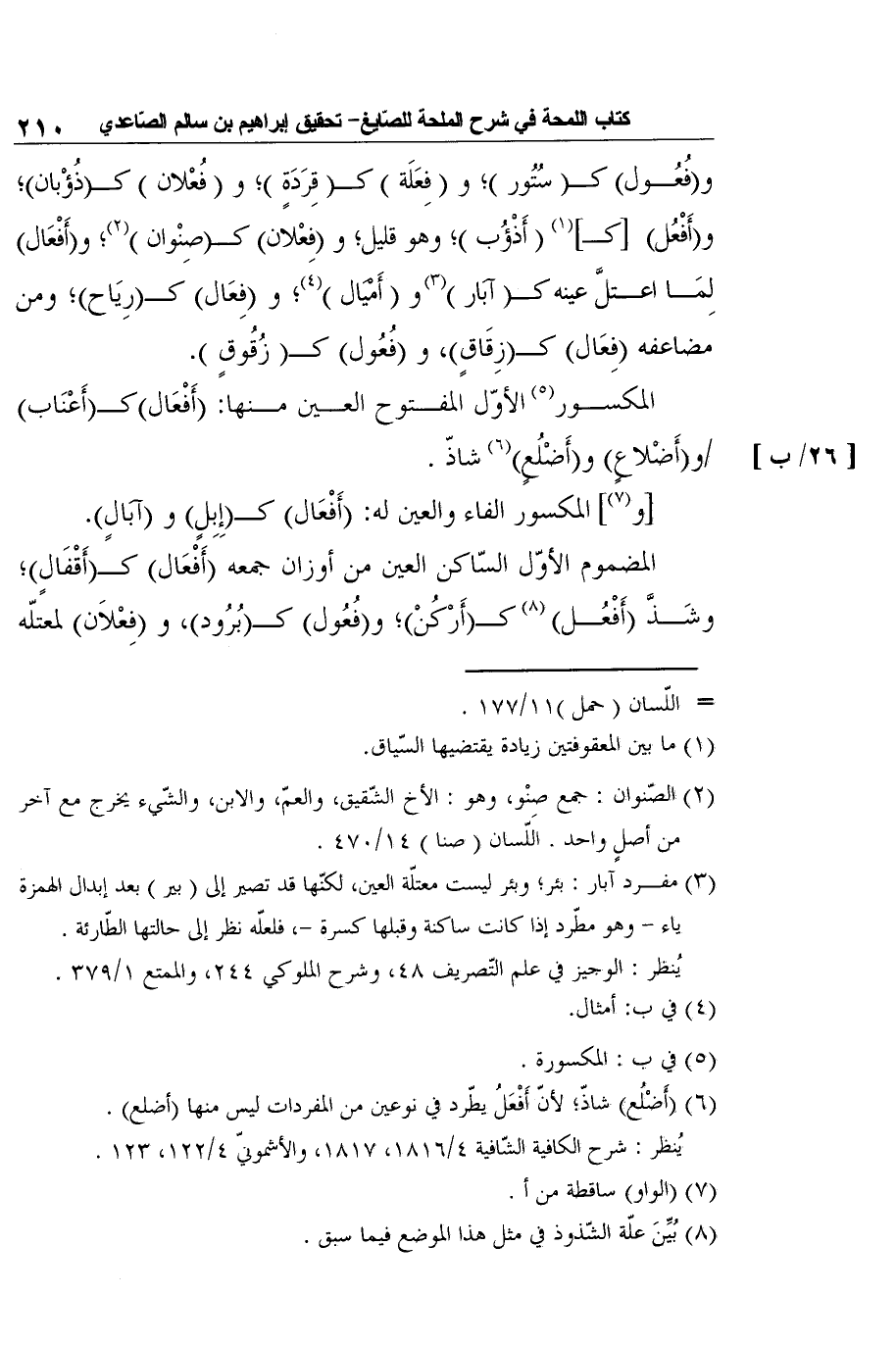المكسور5 الأوّل المفتوح العين منها: [26/ب] (أَفْعَال) كـ (أَعْنَاب) و (أَضْلاعٍ) و (أَضْلُعٍ) 6 شاذّ.