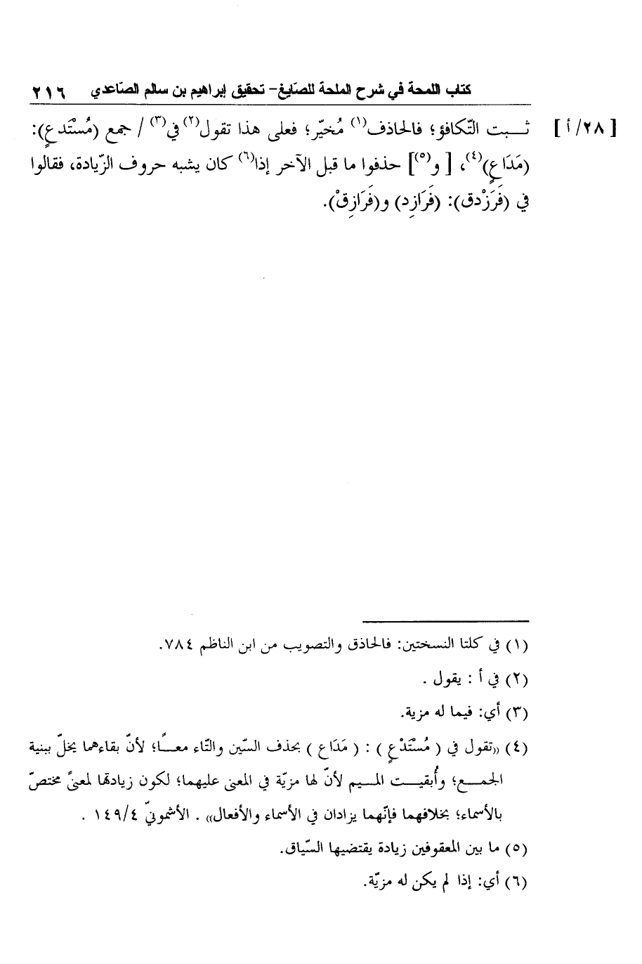4 "تقول في (مُسْتَدْعٍ) : (مَدَاع) بحذف السّين والتّاء معًا؛ لأنّ بقاءهما يخلّ ببنية الجمع؛ وأُبقيت الميم لأنّ لها مزيّة في المعنى عليهما؛ لكون زيادتها لمعنىً مختصّ بالأسماء؛ بخلافهما فإنّهما يزادان في الأسماء والأفعال". الأشمونيّ 4/149.