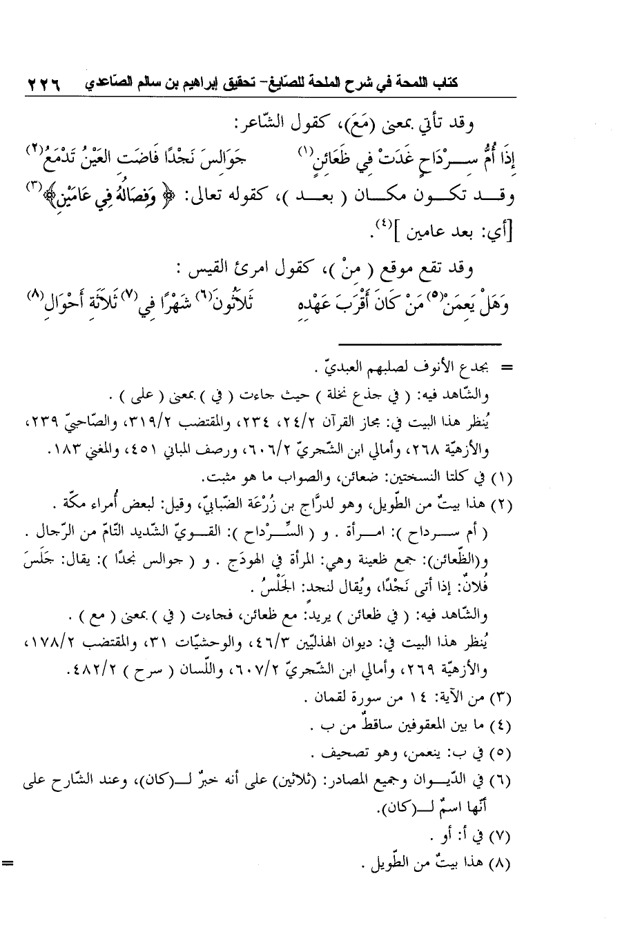 6 في الدّيوان وجميع المصادر: (ثلاثين) على أنه خبرٌ لـ (كان) ، وعند الشّارح على أنّها اسمٌ لـ (كان) .