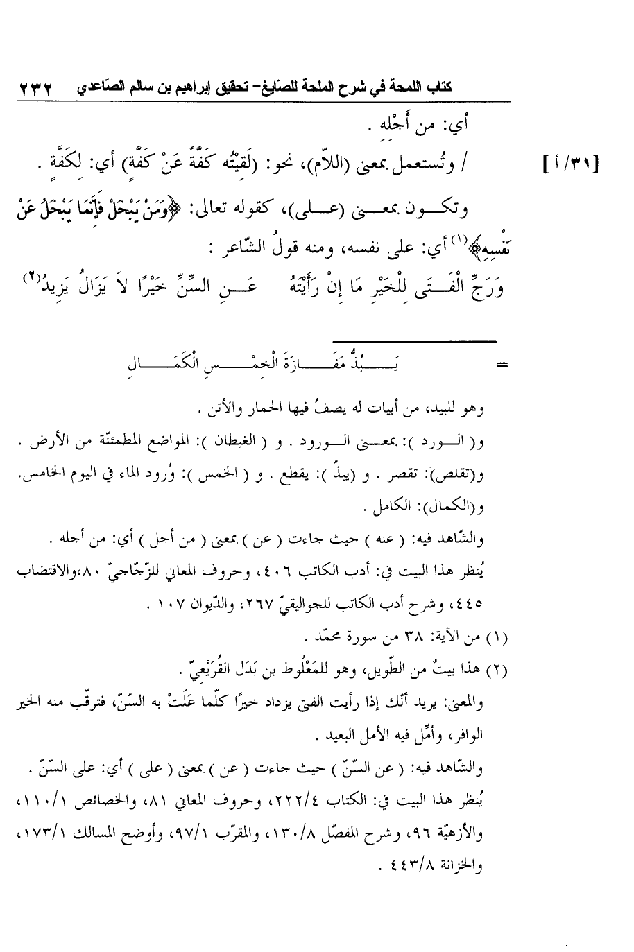 والشّاهد فيه: (عن السّنّ) حيث جاءت (عن) بمعنى (على) أي: على السّنّ.