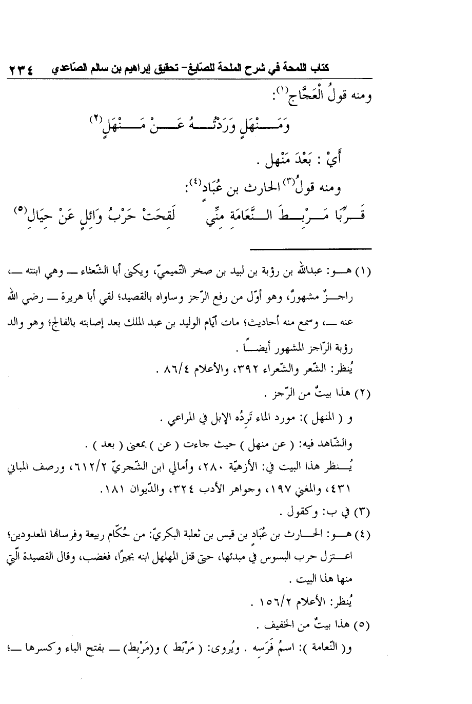 1 هو: عبد الله بن رؤبة بن لبيد بن صخر التّميميّ، ويكنى أبا الشّعثاء ـ وهي ابنته ـ، راجزٌ مشهورٌ، وهو أوّل من رفع الرّجز وساواه بالقصيد؛ لقي أبا هريرة - رضي الله عنه -، وسمع منه أحاديث؛ مات أيّام الوليد بن عبد الملك بعد إصابته بالفالج؛ وهو والد رؤبة الرّاجز المشهور أيضًا.