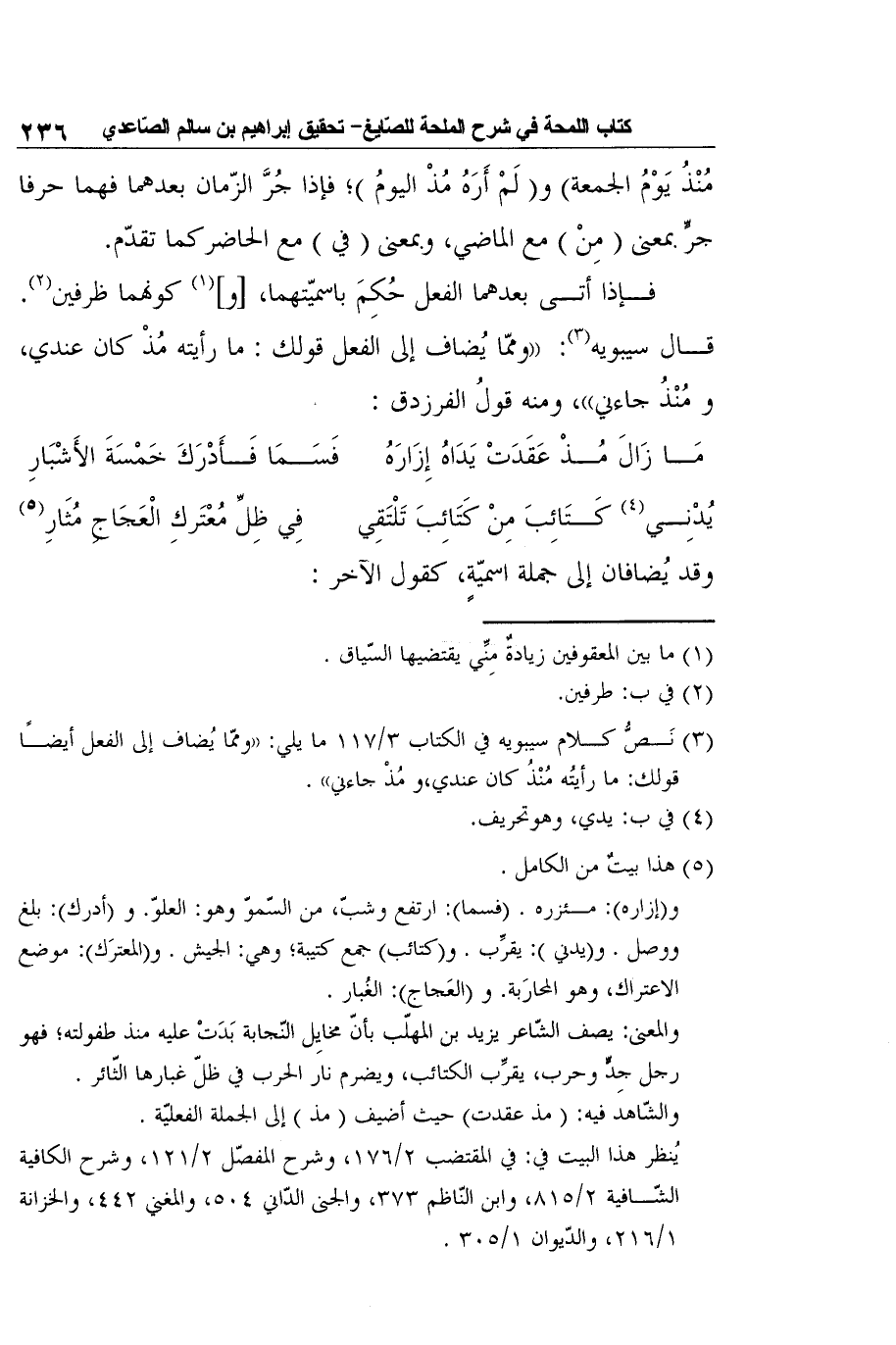 3 نَصُّ كلام سيبويه في الكتاب 3/117 ما يلي:"وممّا يُضاف إلى الفعل أيضًا قولك: ما رأيتُه مُنْذُ كان عندي، ومُذْ جاءني".