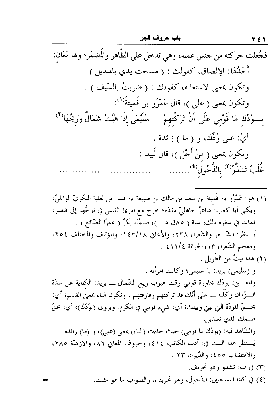 وتكون بمعنى (على) ، قال عَمْرُو بن قَمِيئةَ1: