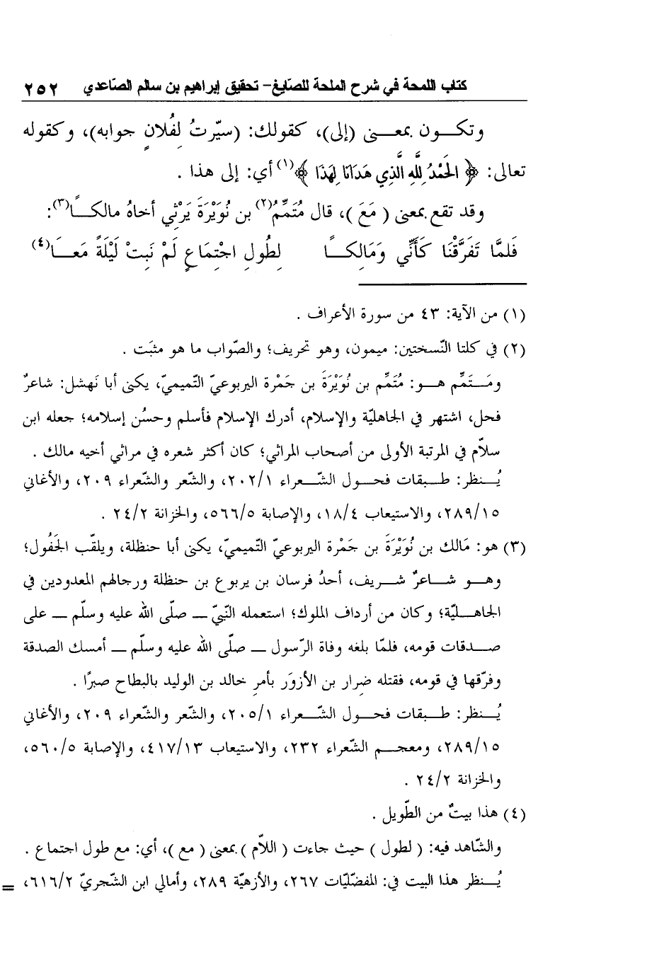 3 هو: مَالك بن نُوَيْرَةَ بن جَمْرة اليربوعيّ التّميميّ، يكنى أبا حنظلة، ويلقّب الجَفُول؛ وهو شاعرٌ شريف، أحدُ فرسان بن يربوع بن حنظلة ورجالهم المعدودين في الجاهليّة؛ وكان من أرداف الملوك؛ استعمله النّبيّ - صلّى الله عليه وسلّم - على صدقات قومه، فلمّا بلغه وفاة الرّسول - صلّى الله عليه وسلّم - أمسك الصدقة وفرّقها في قومه، فقتله ضِرار بن الأزوَر بأمرِ خالد بن الوليد بالبطاح صبرًا.