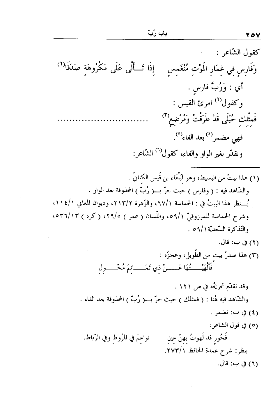 والشّاهد فيه هُنا: (فمثلك) حيث جرّ بـ (رُبّ) المحذوفة بعد الفاء.