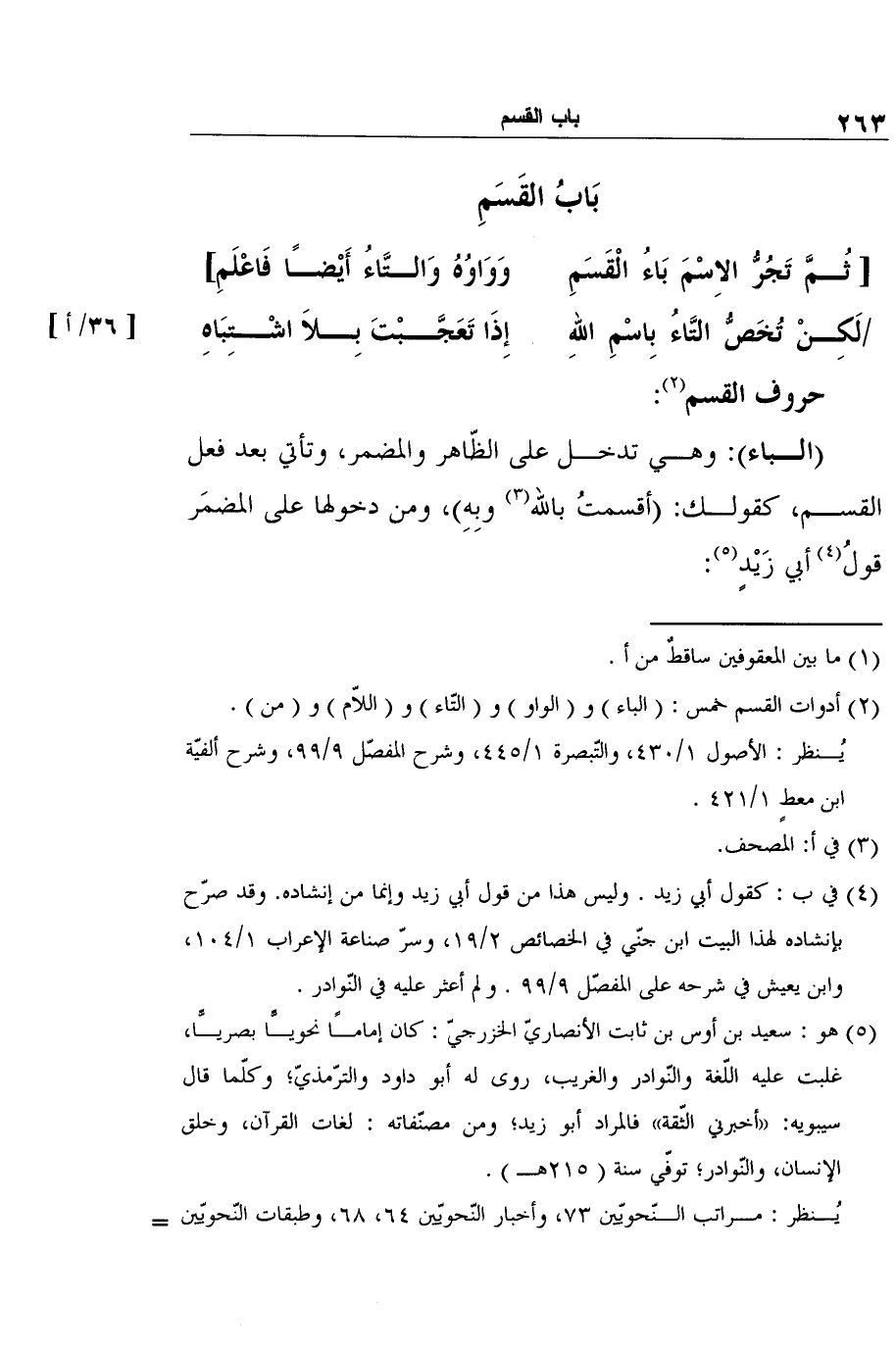 (الباء) : وهي تدخل على الظّاهر والمضمر، وتأتي بعد فعل القسم، كقولك: (أقسمتُ بالله3 وبِهِ) ، ومن دخولها على المضمَر قولُ4 أبي زَيْدٍ5: