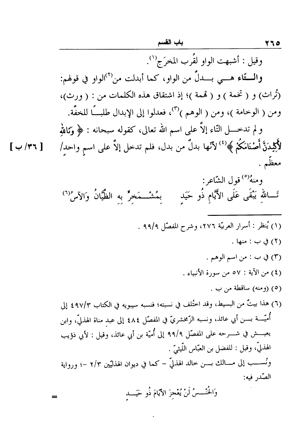 ولم تدخل التّاء إلاَّ على اسم الله تعالى، كقوله سبحانه: {وَتَاللهِ لأَكِيْدَنَّ أَصْنَامَكُمْ} 4 لأنّها بدلٌ من بدل، فلم تدخل إلاَّ على اسمٍ واحدٍ [36/ب] معظّم.