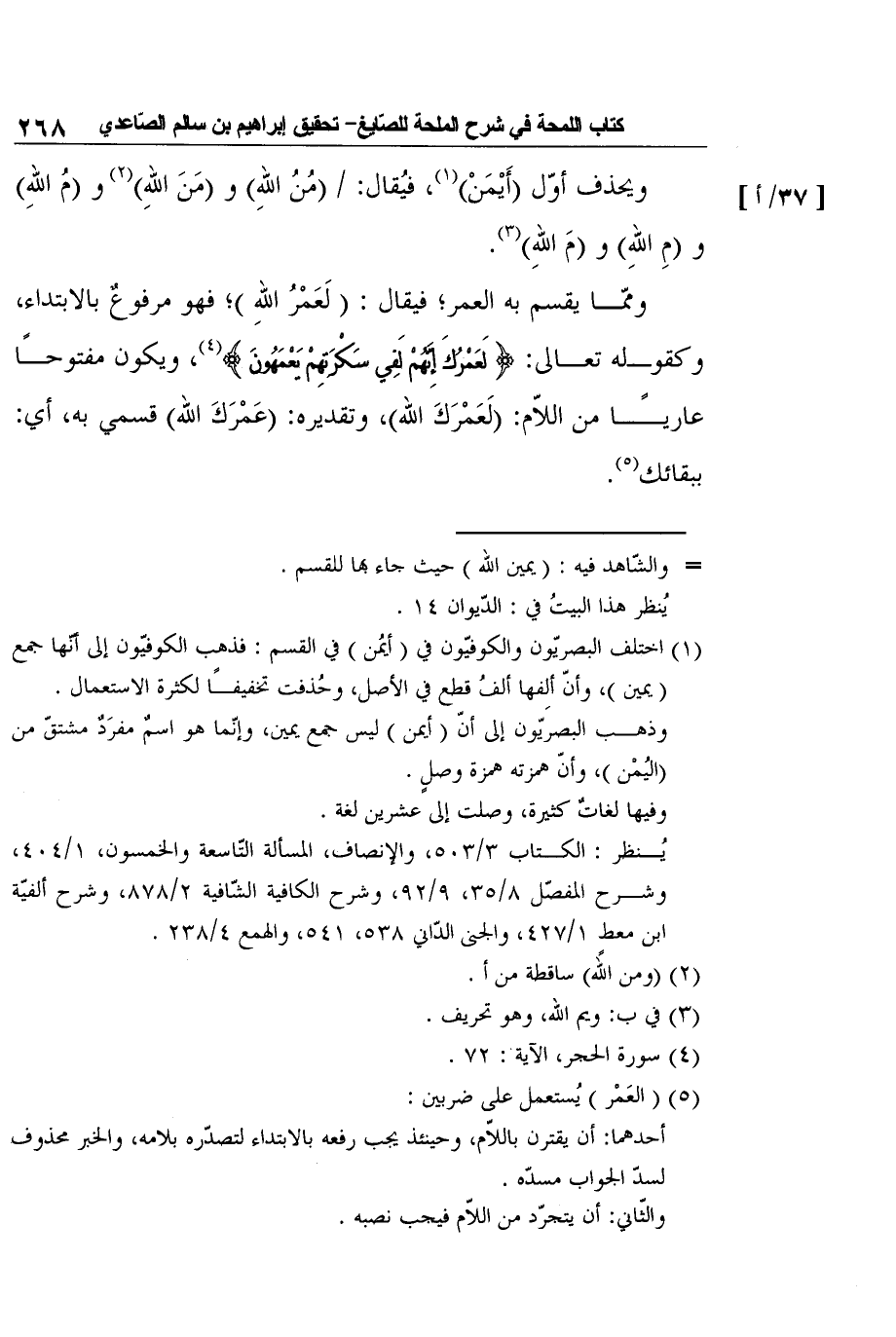 1 اختلف البصريّون والكوفيّون في (أيمُن) في القسم: فذهب الكوفيّون إلى أنّها جمع (يمين) ، وأنّ ألِفها ألفُ قطع في الأصل، وحُذفت تخفيفًا لكثرة الاستعمال.
