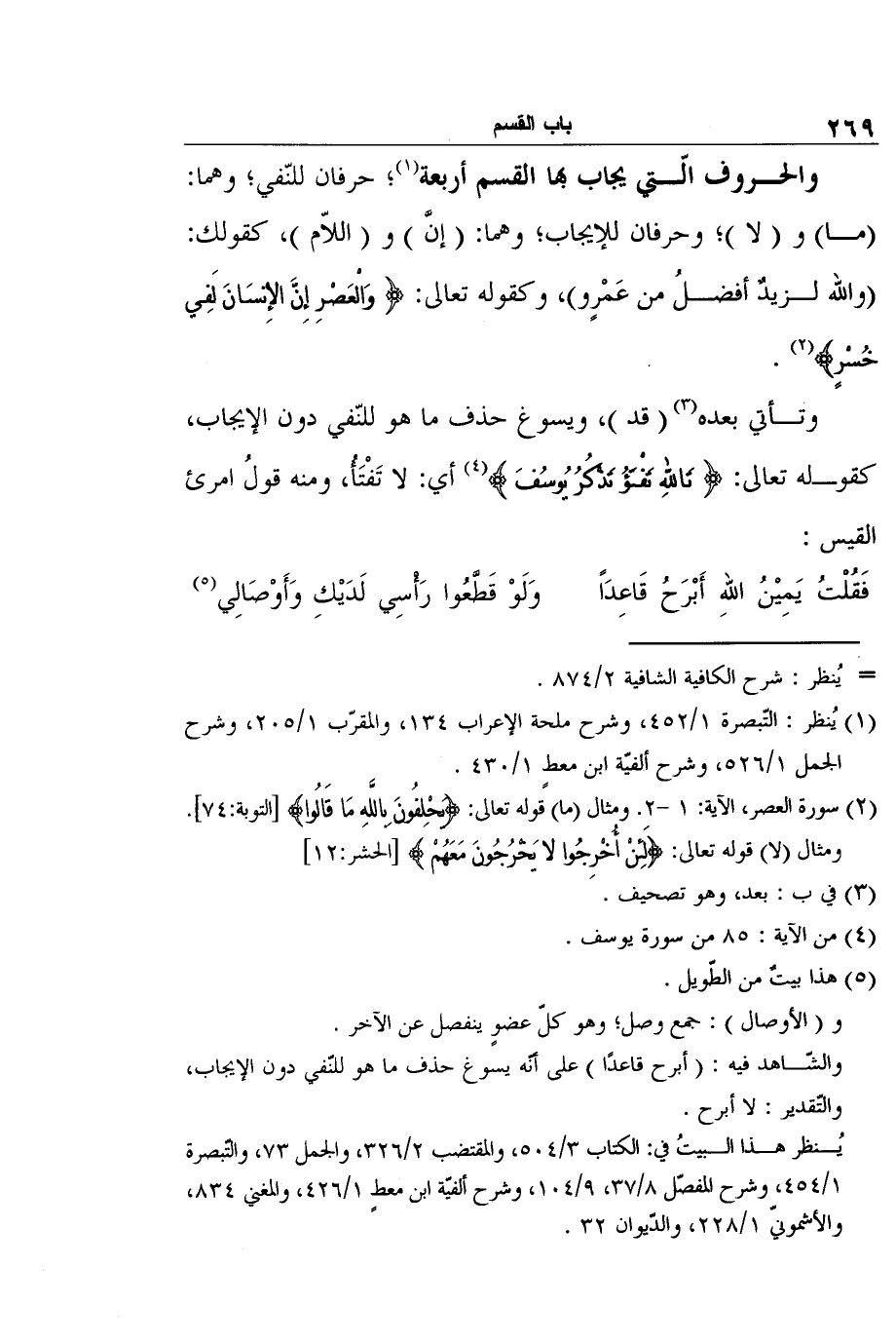 وتأتي بعده3 (قد) ، ويسوغ حذف ما هو للنّفي دون الإيجاب، كقوله تعالى: {تَاللهِ تَفْتَؤُ تَذْكُرُ يُوسُفَ} 4 أي: لا تَفْتَأُ، ومنه قولُ امرئ القيس: